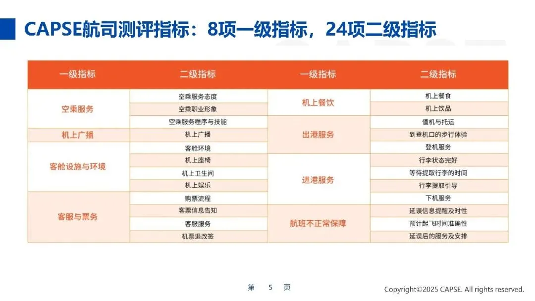 CAPSE以旅客需求为中心,以“数据+管理”模式为导向,以年度为周期调整优化测评指标,具体如下: