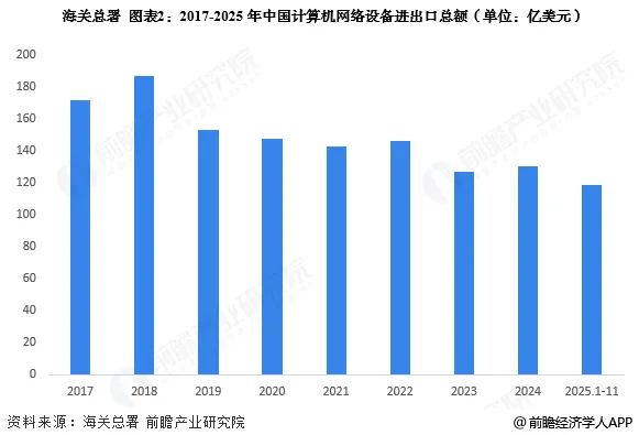 根据海关总署披露的数据显示,2017-2024年中国计算机网络设备进出口总额整体呈现下降态势,2024年进出口总额为130.52亿美元。