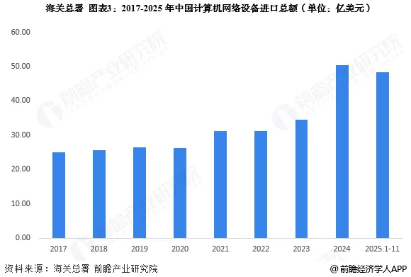 根据海关总署披露的数据显示,2017-2024年中国计算机网络设备进口总额整体呈现上升态势,2024年进口总额为50.37亿美元,2025年1-11月,进口总额48.33亿美元,接近2024年全年水平。