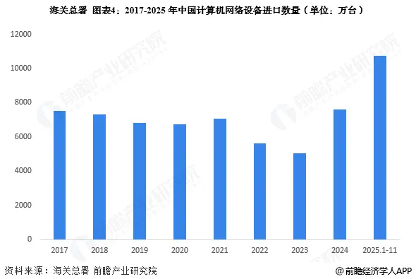 根据海关总署披露的数据显示,2017-2024年中国计算机网络设备进口数量呈波动态势,2024年进口总量为7607万台,较2023年有较大幅度提升,2025年1-11月,进口总量超过1亿台。