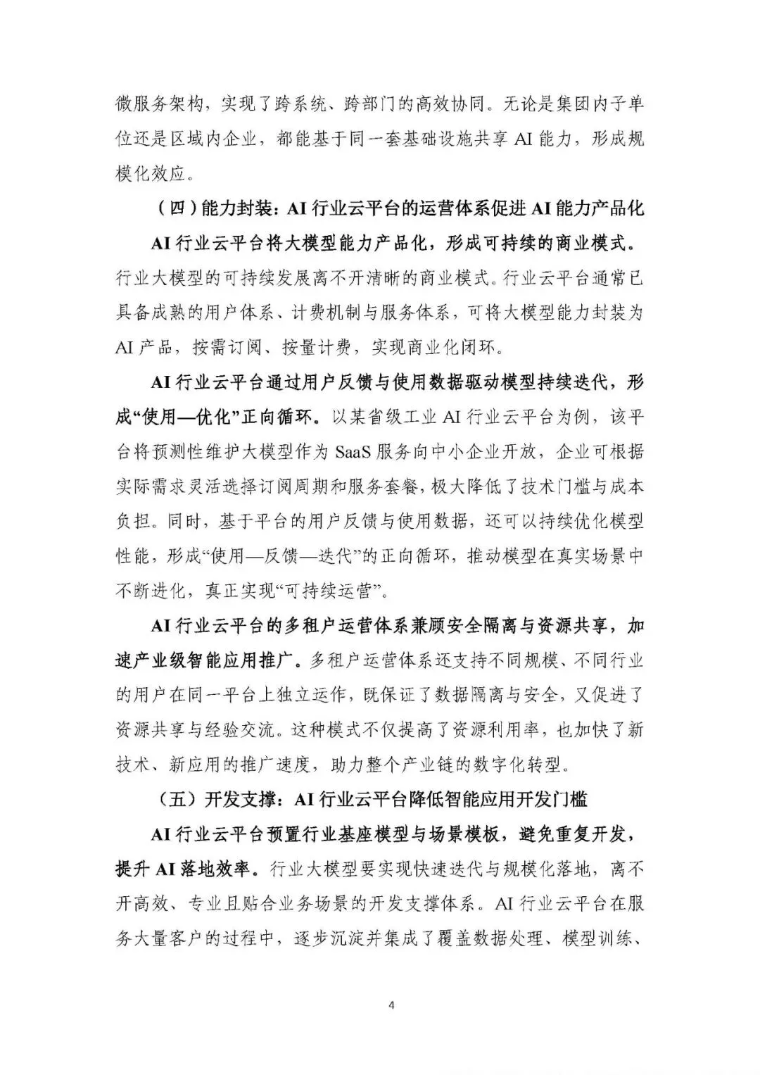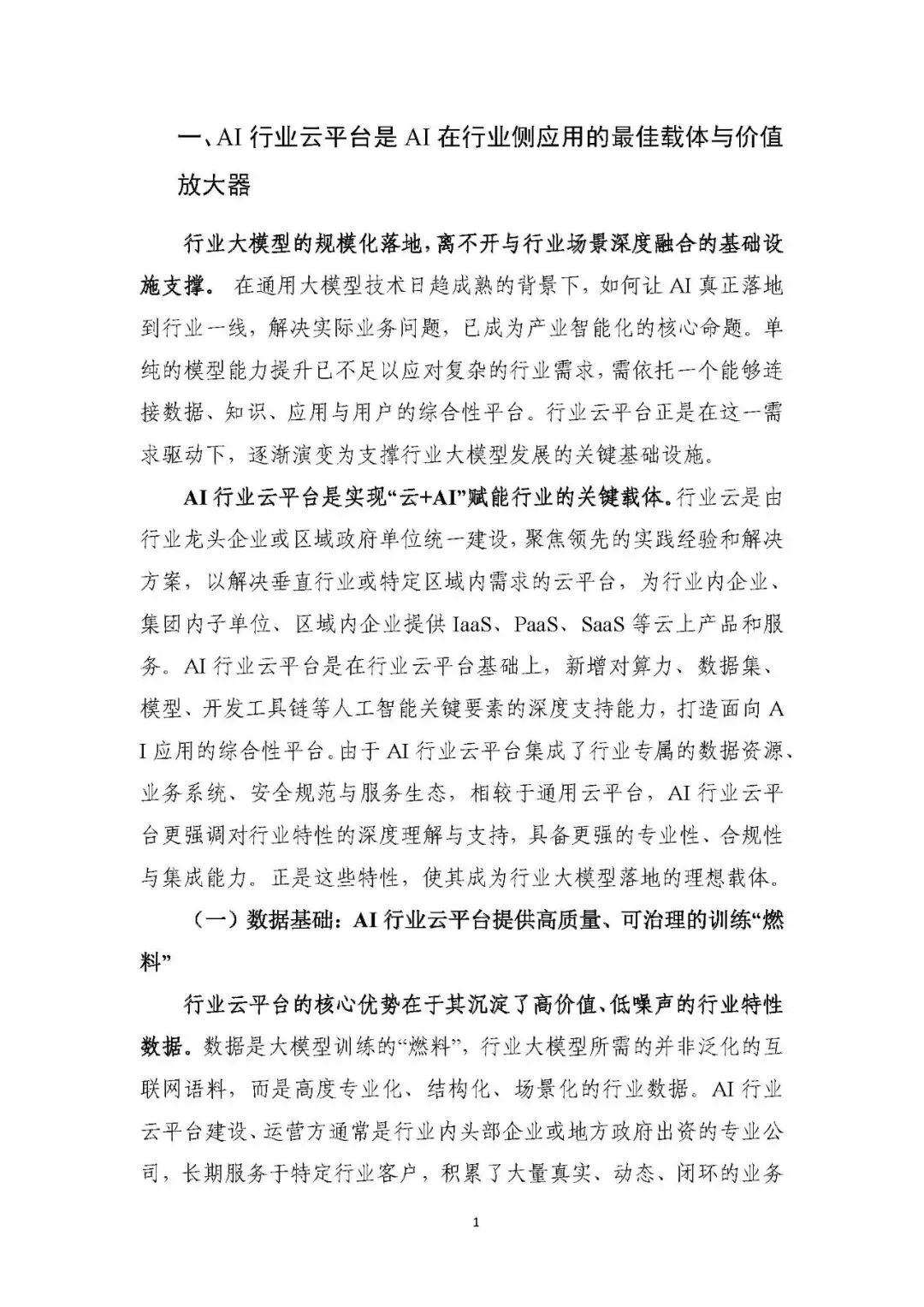 本报告聚焦“云+AI”深度融合的发展趋势,系统性梳理如何以AI行业云平台作为支撑行业大模型可持续发展的核心载体。通过分析行业云在高质量数据供给、可信运行环境、生态协同机制和商业化路径等方面的独特优势,深入探讨其如何赋能行业大模型实现从技术研发到业务价值转化的全生命周期管理。同时,结合气象、制造、医疗、能源等领域的典型实践,展望“行业云+AI”协同演进的技术路径与产业图景,旨在为各行业推进智能化转型提供兼具前瞻性与实操性的参考框架。