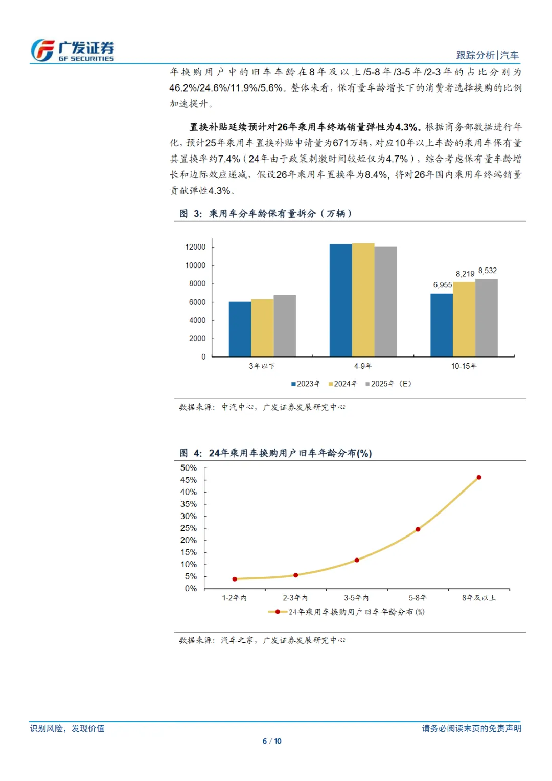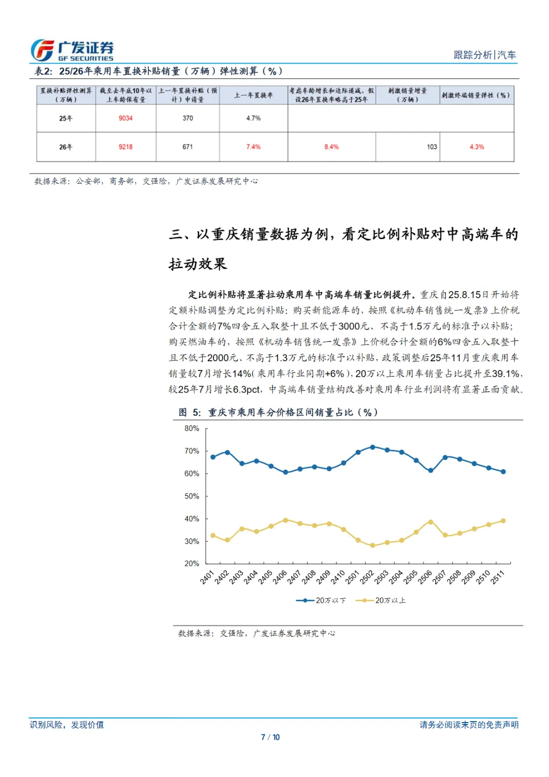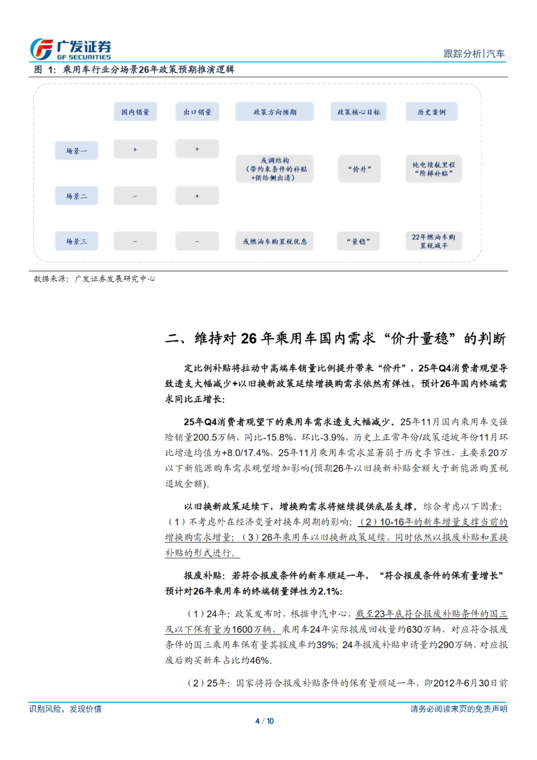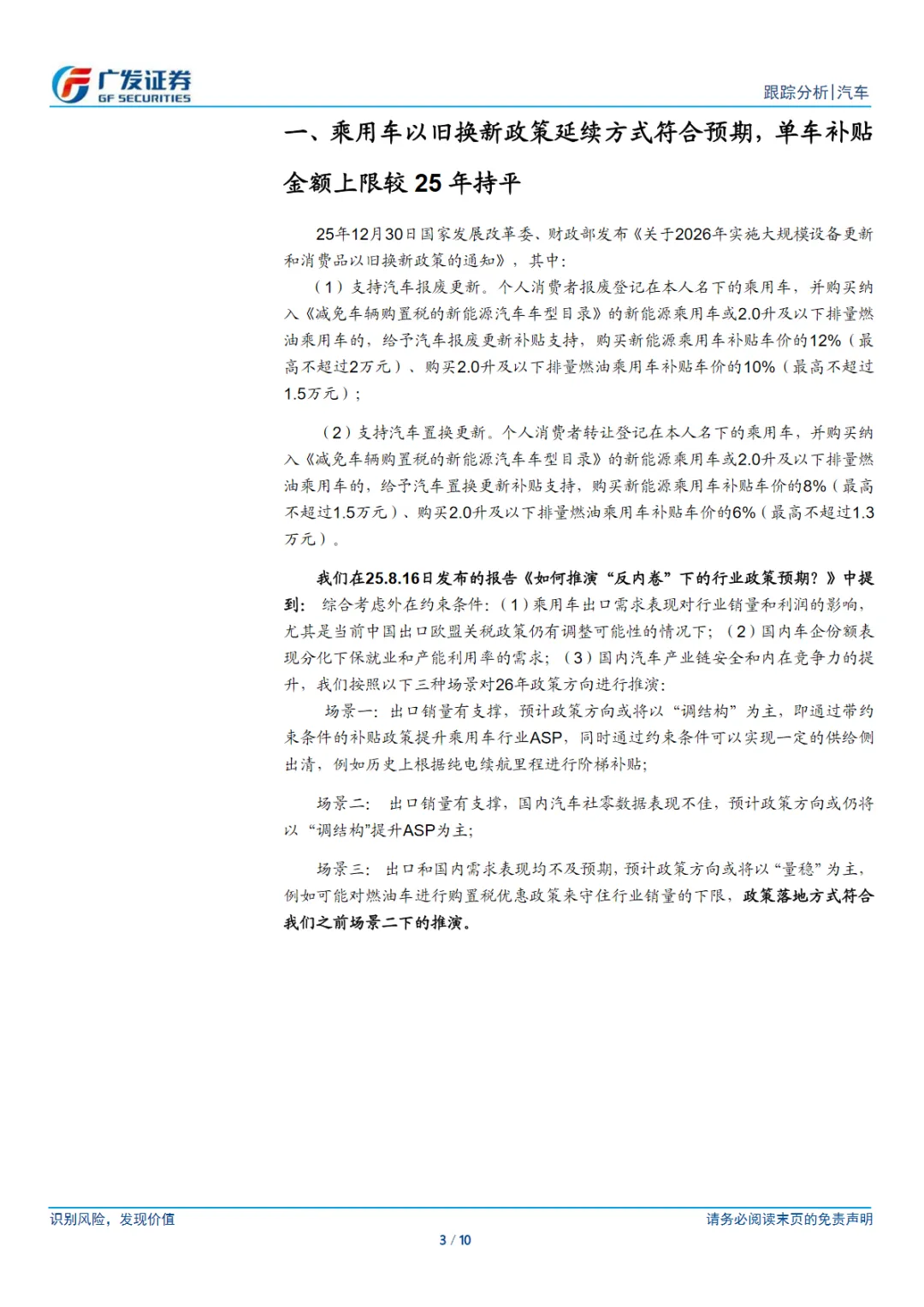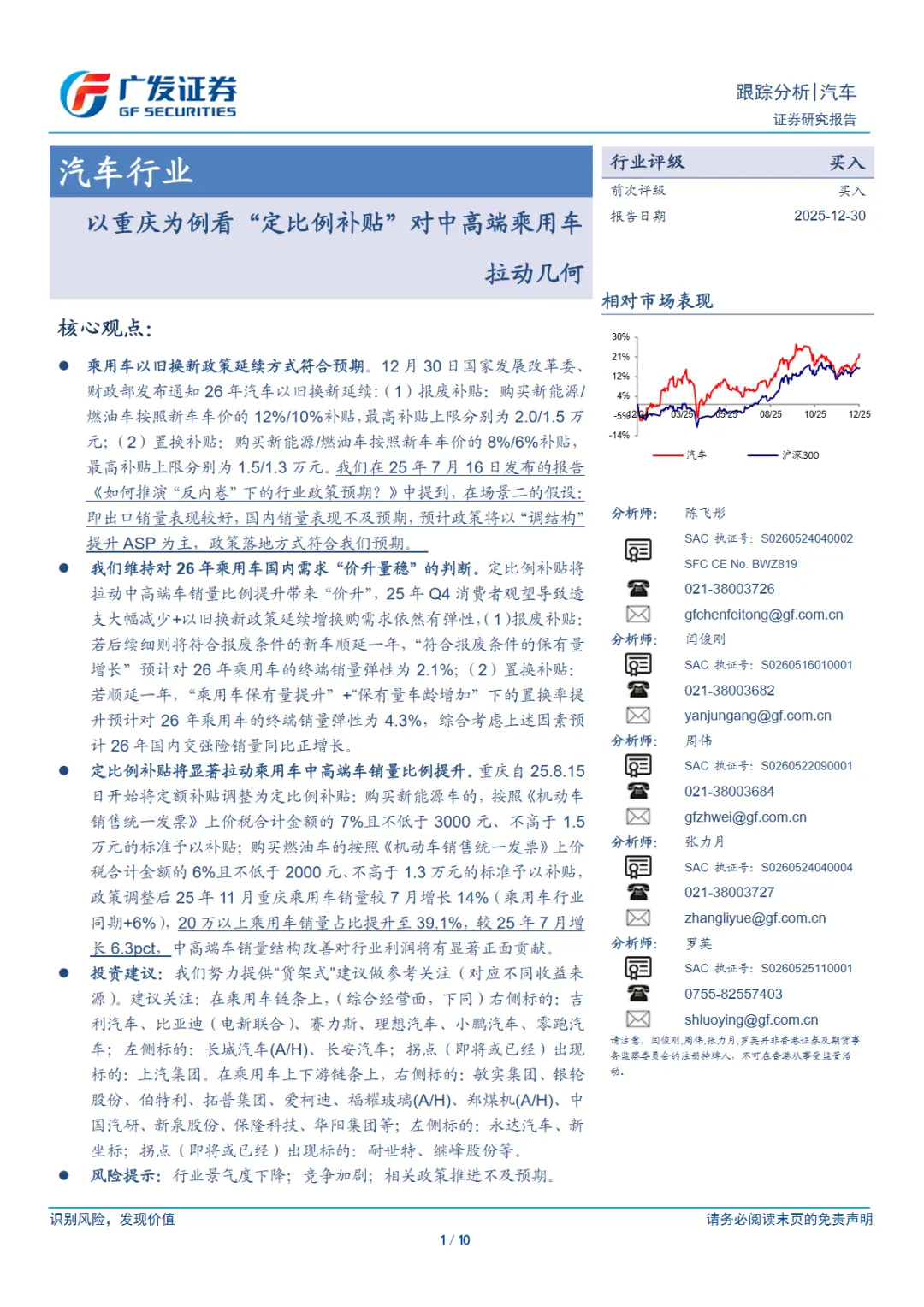 本篇行业报告可以通过扫下方知识星球下载。39元就可以下载星球所有报告。免费提供报告查找服务。根据广发证券的研究报告,2026年汽车以旧换新政策的延续方式符合预期,这一政策预计将对中高端乘用车市场产生积极影响。报告中指出,报废补贴和置换补贴将分别按照新车车价的12%和8%进行,上限分别为2万元和1.5万元。这一政策预计将提升中高端车销量比例,从而实现“价升量稳”的市场表现。报告分析了重庆市场的数据,发现自2025年8月15日政策调整后,重庆乘用车销量增长14%,20万以上乘用车销量占比提升至39.1%,显示出定比例补贴对中高端车销量的显著拉动效果。这一政策的实施,不仅能够刺激中高端车市场的需求,还能对行业利润产生正面贡献。在投资建议方面,报告提供了“货架式”的建议,关注不同收益来源的标的。建议关注的企业包括吉利汽车、比亚迪、赛力斯、理想汽车、小鹏汽车、零跑汽车等,这些企业在乘用车链条上表现出较强的市场竞争力。同时,报告也提醒投资者关注行业景气度下降、竞争加剧以及相关政策推进不及预期等潜在风险。总体而言,广发证券的报告对2026年乘用车市场的前景持乐观态度,特别是对中高端乘用车市场的增长潜力给予了肯定。报告通过对政策的深入分析和市场数据的详细解读,为投资者提供了有价值的参考和投资建议。免责声明:以上分享报告为公开合法渠道获得,内容大部分来源于网络,版权归原作者所有,如有侵权,请及时与我们联系,我们将第一时间保障您的权益。推荐内容仅供参考学习,不构成投资建议。