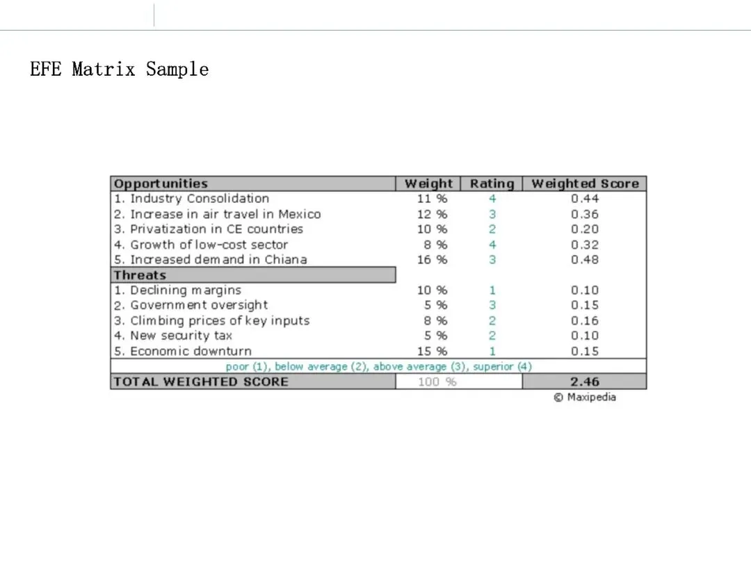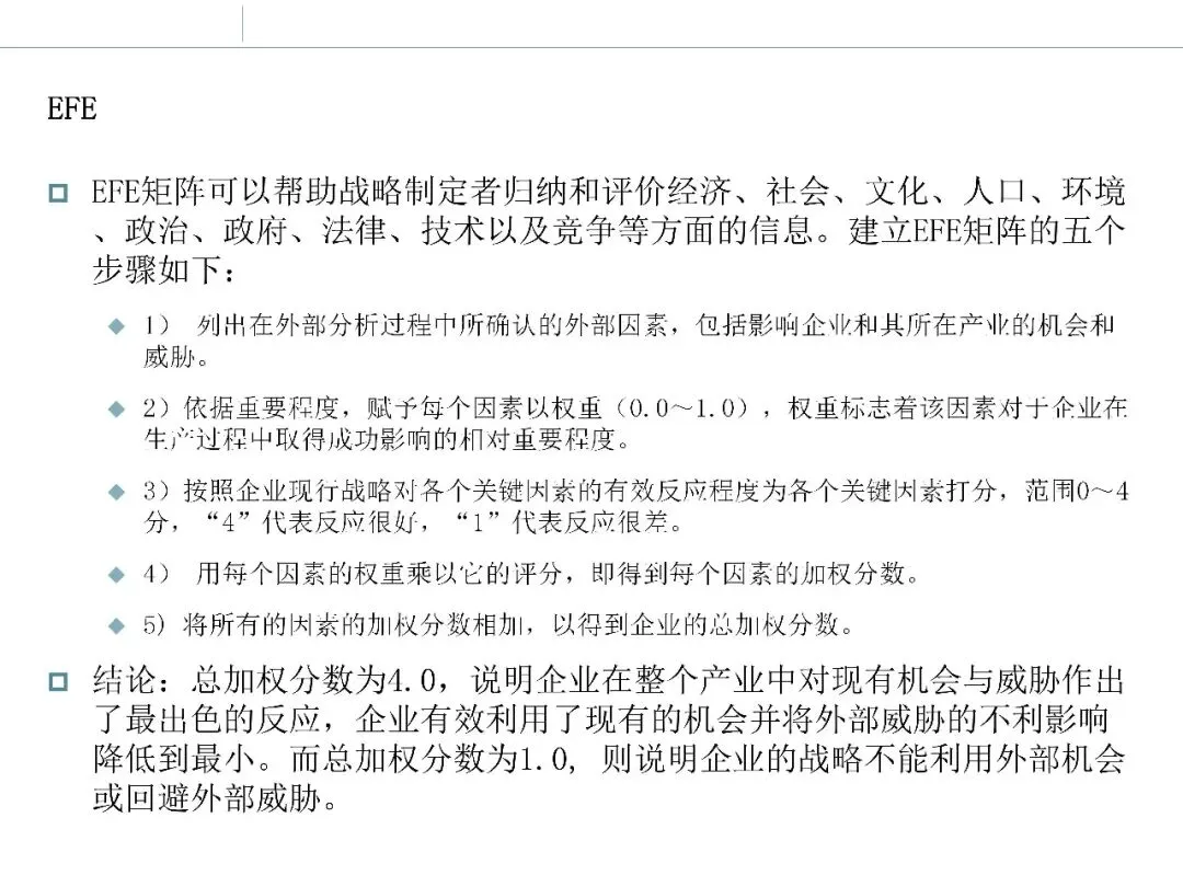 EFE 矩阵通过对外部因素的重要性和企业应对能力进行加权评价,使宏观判断从定性走向半定量。其核心意义在于:迫使调研者明确哪些外部因素“真正关键”,并检验企业是否高估或低估了这些因素的影响。