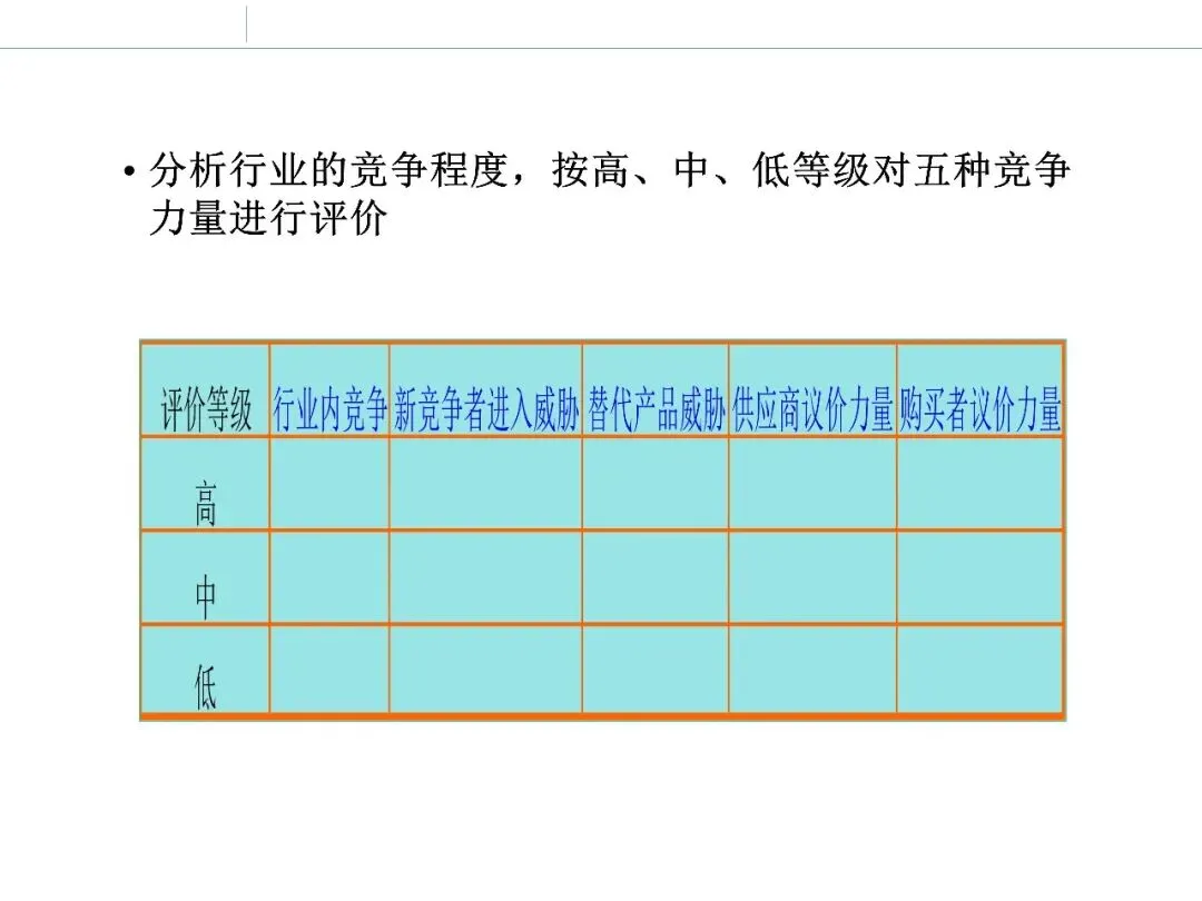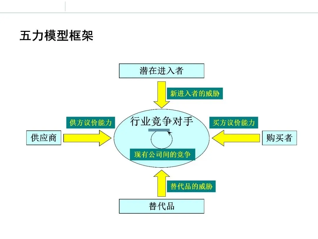 波特五力模型从行业内竞争、潜在进入者、替代品、供应商议价能力和购买者议价能力五个方面,分析行业结构与竞争强度。