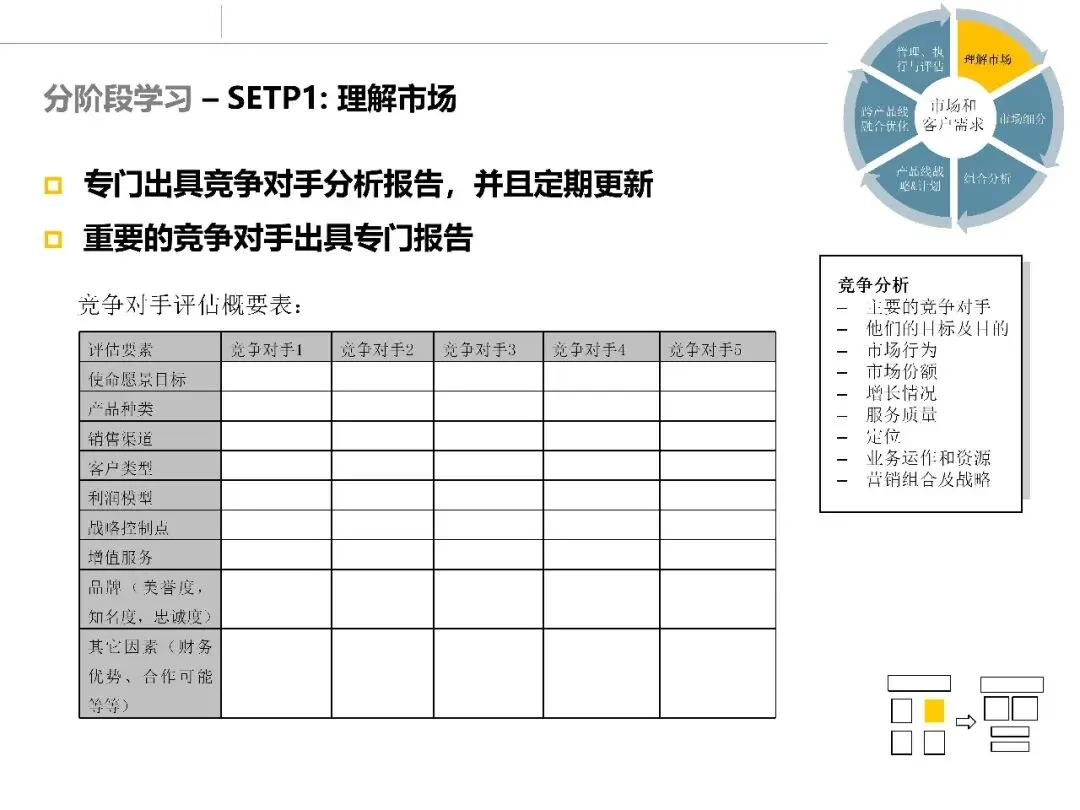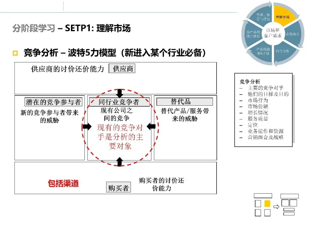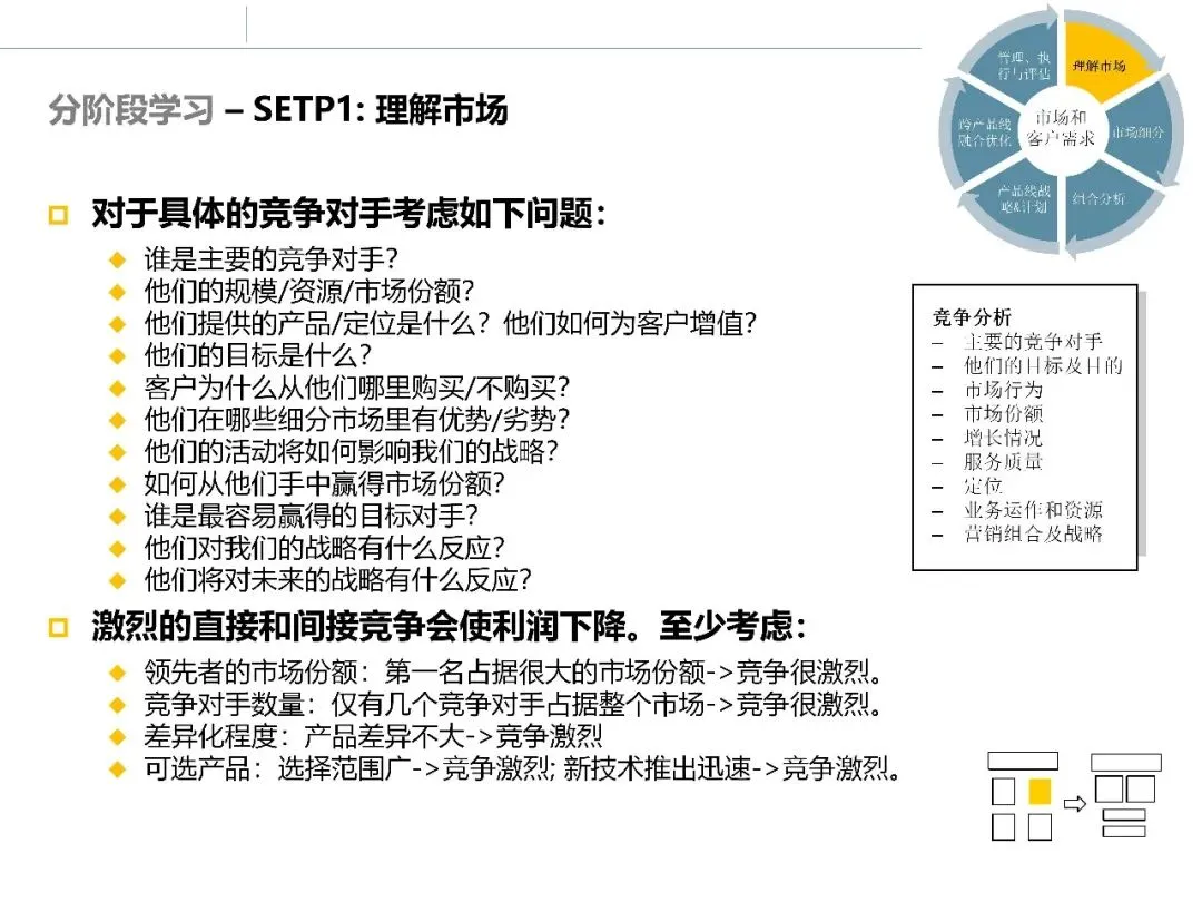 竞争对手分析聚焦于主要竞争者的目标、定位、资源能力、市场行为与竞争策略。其价值在于帮助企业理解:对手是如何获取优势的,这些优势是否可复制,以及企业自身可能的突破点在哪里。