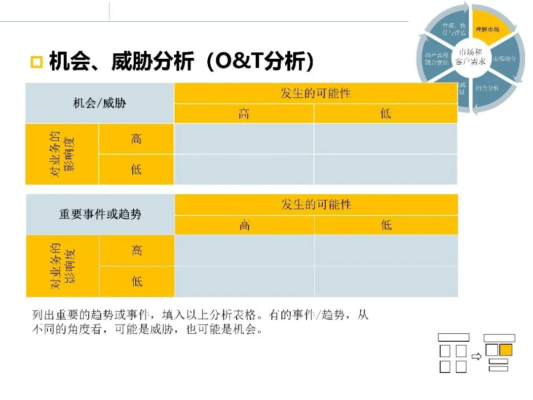 基于 PESTEL 的分析结果,进一步提炼对市场产生正向或负向影响的关键事件和趋势,形成初步的机会与威胁判断。这一步是宏观调研向行业调研过渡的重要桥梁。