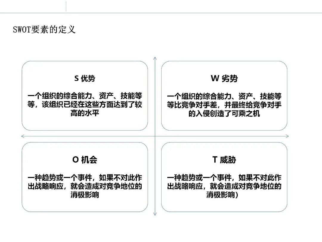 SWOT 将外部的机会与威胁、内部的优势与劣势进行系统整合,用于评估企业参与某一市场的整体条件。它本身并不直接给出答案,但为战略判断提供结构化背景。