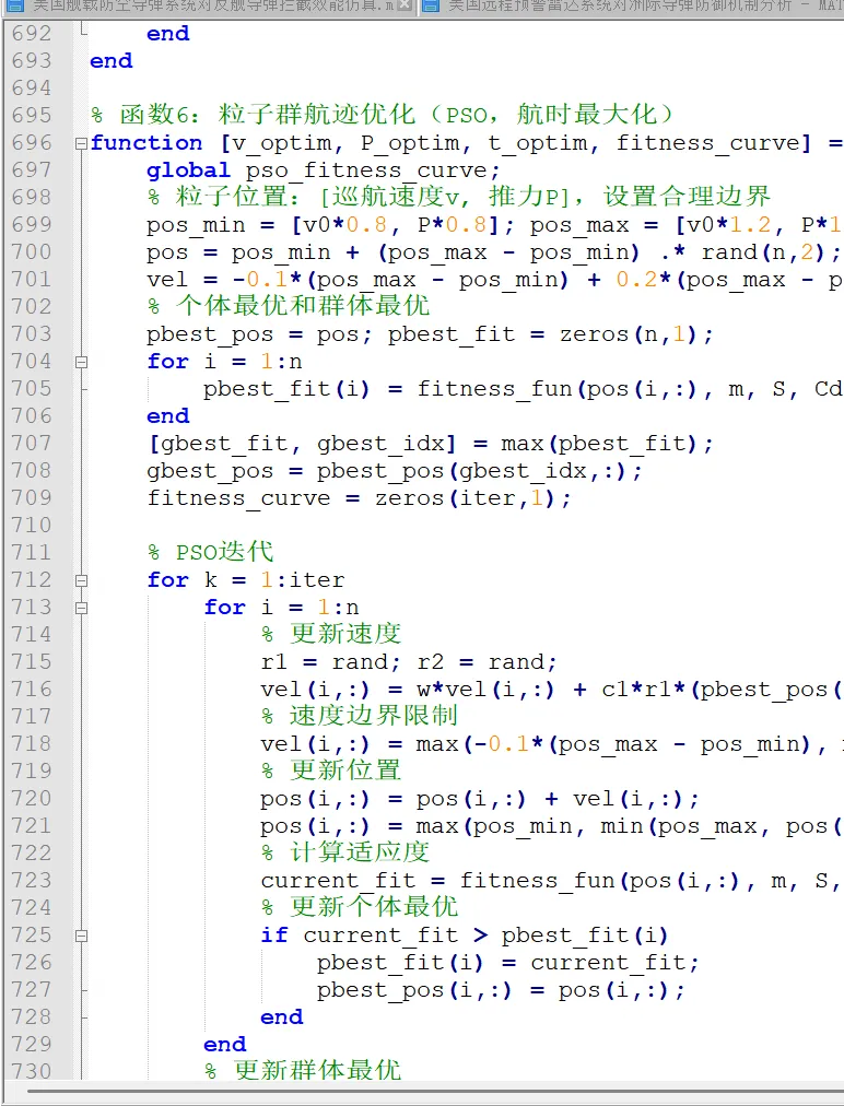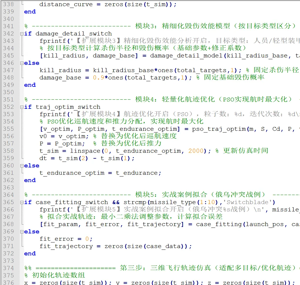 代码分为4 个功能模块,附带详细注释,可根据报告需求修改参数(如巡飞弹型号、战场环境、目标参数),所有变量均标注物理意义,便于报告中解读。