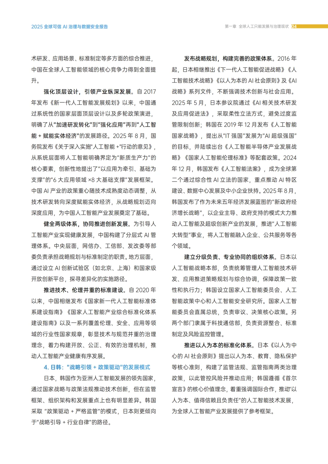 全球 AI 发展呈现 “中美双极主导,多强梯队跟进” 格局,主要国家和地区已形成治理共识,构建了各具特色的监管框架:欧盟以风险分级为核心推行统一立法,美国采用联邦与州双轨并行的分散化自律模式,中国构建国家 - 行业 - 地方三级治理体系,日韩则呈现 “软硬结合 + 协同治理” 特征。