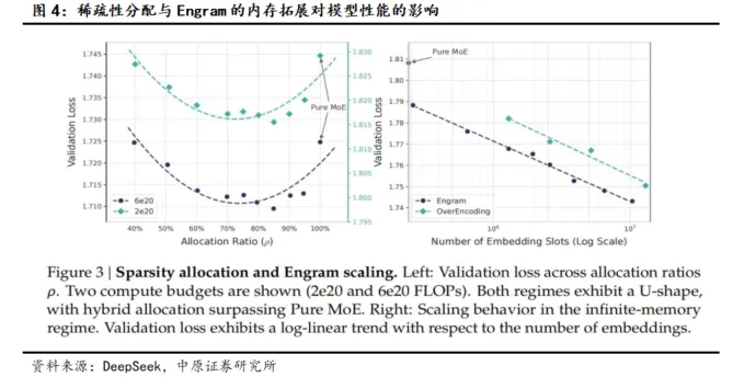 由于Engram是对文本进行哈希映射,映射对象为规模可扩展的静态记忆表,进行常数时间复杂度的知识检索,查找复杂度与模型规模无关,因而达到了稀疏的效果。实验表明,当20%-25%的稀疏参数预算分配给Engram时(剩余部分留给MoE),模型整体性能达到最佳。