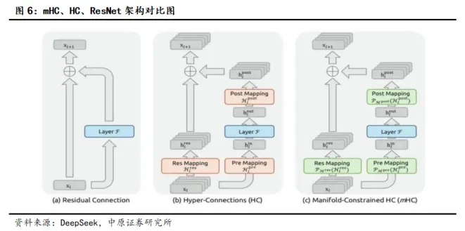 2026年1月1日,DeepSeek论文提出了名为mHC的新网络架构,解决信息的流动。mHC架构是建立在此前字节发布的HC基础上,重点改进了ResNet架构信息通道宽度受限、增加的计算冗余和内存占用的问题。在MoE模型上,mHC使得模型训练的收敛速度提升了约1.8倍。