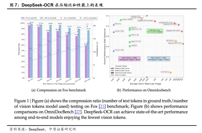 DeepSeek的实验数据显示,当文本token数在视觉token的10倍以内(即压缩率<10×)时,模型的解码精度可达97%;当压缩率达到20×,解码准确率仍保持在约60%,展现出了非常大的发展潜力。