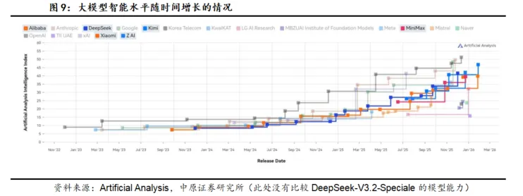 以DeepSeek目前的行事风格来看,其仍然是开源路线最坚定的拥护者,有望继续开源路线。目前,国产厂商主要坚持开源路线,且模型性能较海外还有一定落后,但是成本控制上优势较为明显。我们认为V4如果能够实现能力较大超越,将对海外闭源模型厂商,特别是以OpenAI、Anthropic为代表的仅专注于大模型赛道的厂商形成较大的盈利冲击,并有望深刻改变海外AI产业的发展格局。