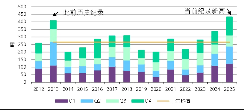 量价齐升的是投资属性更强的金条金币。2025年四季度,金条金币需求量环比激增61%,同比增长42%,达119吨。2025年全年,中国投资者累计购入432吨金条金币,较2024年增长28%,创年度历史新高。