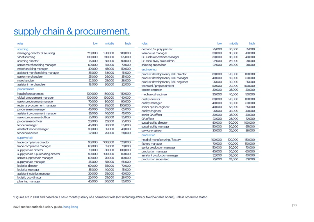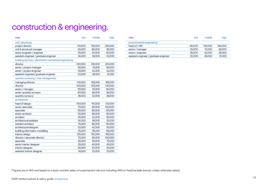 各行业薪酬体系呈现差异化特征。建筑与房地产领域,高层管理岗如设施总监月薪最高可达 20 万港元;供应链与采购行业,采购负责人月薪区间为 10 万 - 15 万港元;金融服务行业,私人银行管理岗月薪超 30 万港元,IPO 相关专业人才因市场回暖需求激增;科技行业中,人工智能、网络安全等 niche 人才薪资涨幅达 18%-25%,CIO/CTO 等高管月薪最高 28 万港元;法律行业,国际律所资深律师月薪可达 17.5 万港元。