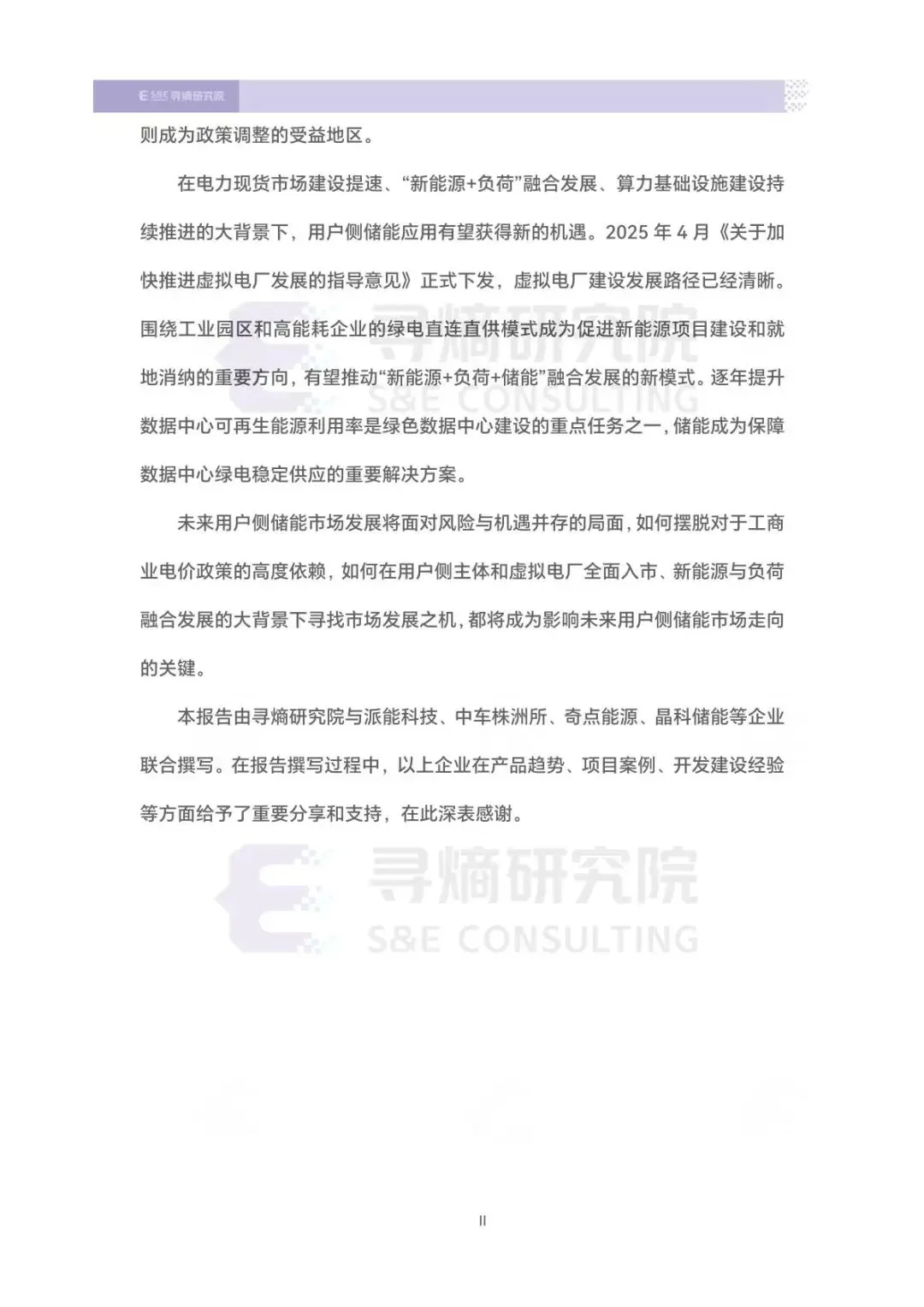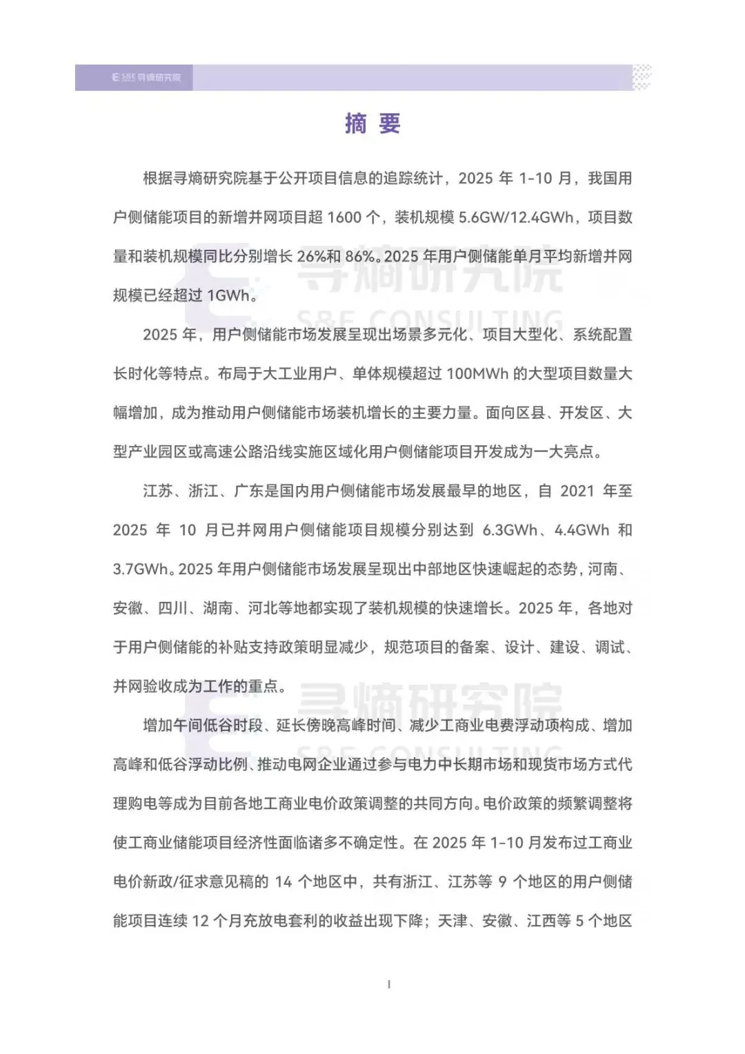 《中国用户侧储能发展报告 2025》公开项目信息的追踪统计,系统覆盖 2025 年中国用户侧储能市场的规模、特征、政策影响、区域格局、产品技术及新兴场景,全面呈现行业发展现状与趋势。报告还深入挖掘了虚拟电厂、绿电直连、绿色数据中心等新兴场景的应用潜力,为行业摆脱单一峰谷套利依赖、迈向多元价值实现提供了数据支撑与实践参考。