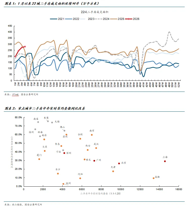2026年开年以来,房地产市场在“量”“价”两个方面出现了积极变化,第一个变化是重点城市二手房成交持续放量,第二个变化是二手房成交价结束了2025年6月以来的加速下跌。