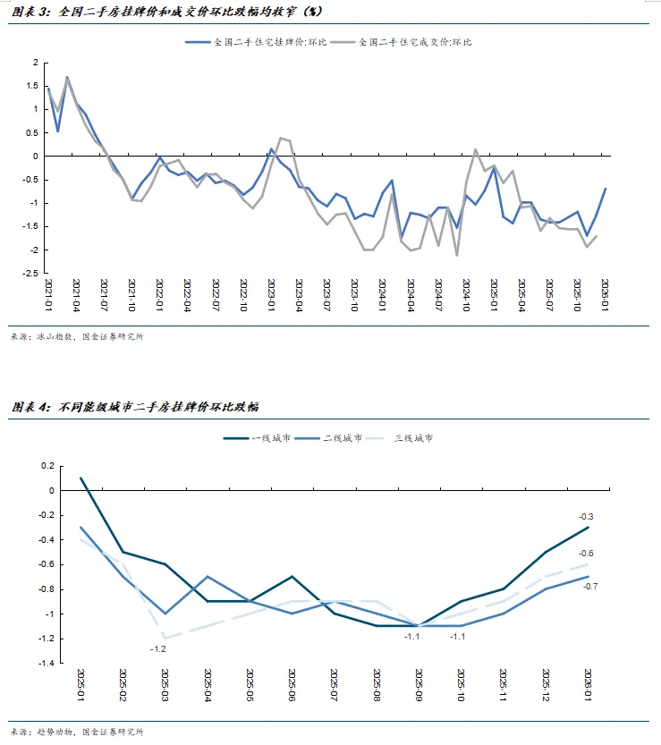 第二个变化是二手房成交价结束了2025年6月以来的加速下跌。1月全国二手住宅挂牌价环比降幅收窄至-0.7%,而此前半年的月环比跌幅基本保持在-1.3%左右。剔除结构性失真和成交滞后的干扰,房价跌速放缓的趋势更加明显,1月一、二、三线城市二手房挂牌价格月环比分别为-0.3%、-0.7%、-0.6%,较2025年底-0.5%、-0.8%、-0.7%的月环比跌幅改善。