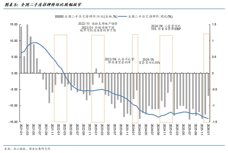 年初以来房价跌幅的收窄主要是受季节性因素的影响。房地产市场于2021年6月开启下行周期,此后每年年底房价跌幅均明显收窄,并于次年3-4月开启新一轮下跌周期。这背后的原因是临近春节卖家观望情绪增加,在“与其主动降价不如等待‘金三银四’行情”的心态下,房价跌速往往放缓。但这也导致二手房挂牌量在3、4月快速上升,供需失衡往往导致4月之后房价跌幅再度走阔。