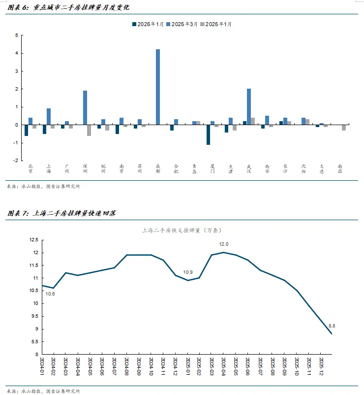随着“金三银四”的临近,叠加房地产市场经过四年半的调整,估值已基本回到底部区间,买卖双方的预期正在发生转变,并体现在二手房挂牌量的变化上。以上海为例,二手房挂牌量自2025年5月连续9个月回落,目前上海二手房狭义挂牌量已降至8.9万套,较2025年4月12.0万套的峰值减少3.1万套,达到过去两年的最低水平。此外,北京、南京、厦门、天津等城市二手房挂牌量回落较快,较2025年12月分别下降0.6、0.5、1.1、0.4万套。