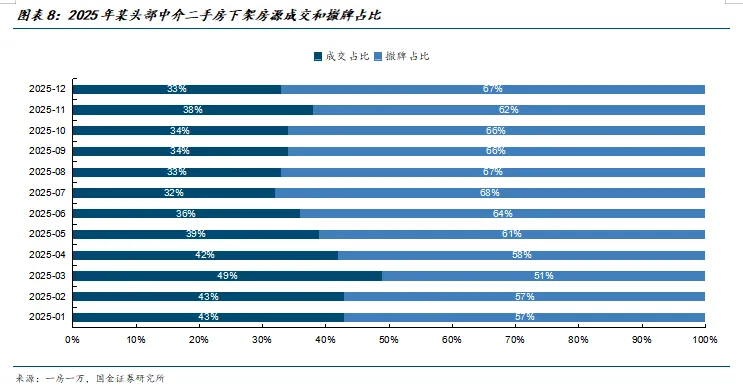 值得注意的是,二手房挂牌量的下降不一定需要成交的改善,也可以是卖家的主动撤牌。2025年5月以来,上海某头部中介下架房源里超过60%是卖家主动撤牌。随着房价的持续调整,部分卖家难以接受以亏本的价格出售房产,选择“售转租”,将房子视为类固收资产。