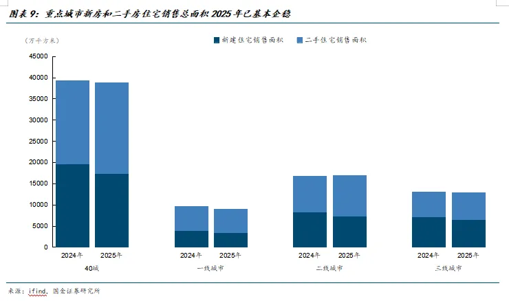 重点城市住宅总需求已经基本企稳。2025年40城新建住宅销售面积1.74亿平方米,同比下降11.6%。但新房销售的“缩量”更多源于二手房成交占比提升导致的成交结构变化,而非居民购房需求的萎缩。如果将二手房纳入考量,2025年40城新房和二手房住宅销售总面积约为3.88亿平方米,和2024年的3.93亿平方米基本持平。
