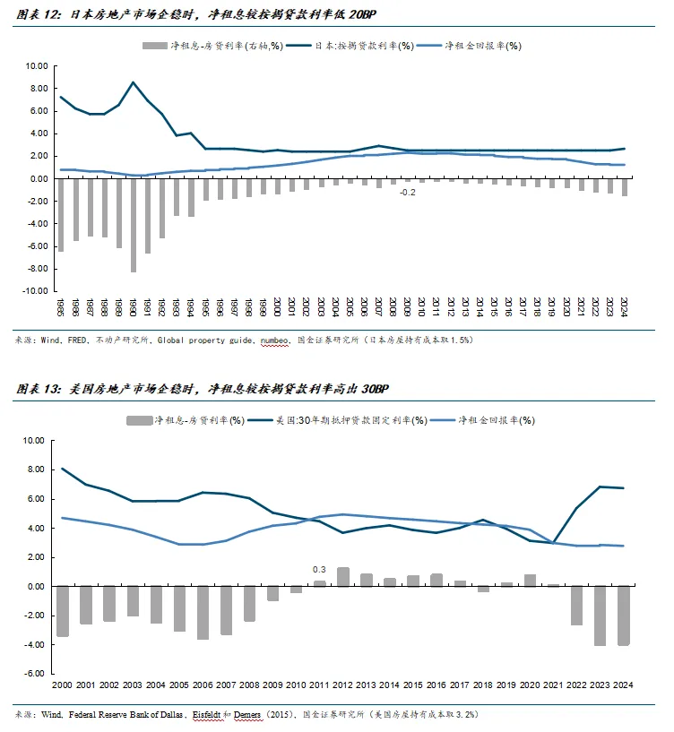 值得注意的是,上述情形往往出现在深度调整的地产下行周期中,如美国次贷危机期间和日本地产泡沫破裂期间。对于较为温和的地产下行周期而言,净租金回报率通常无需达到和按揭贷款利率接近的水平。