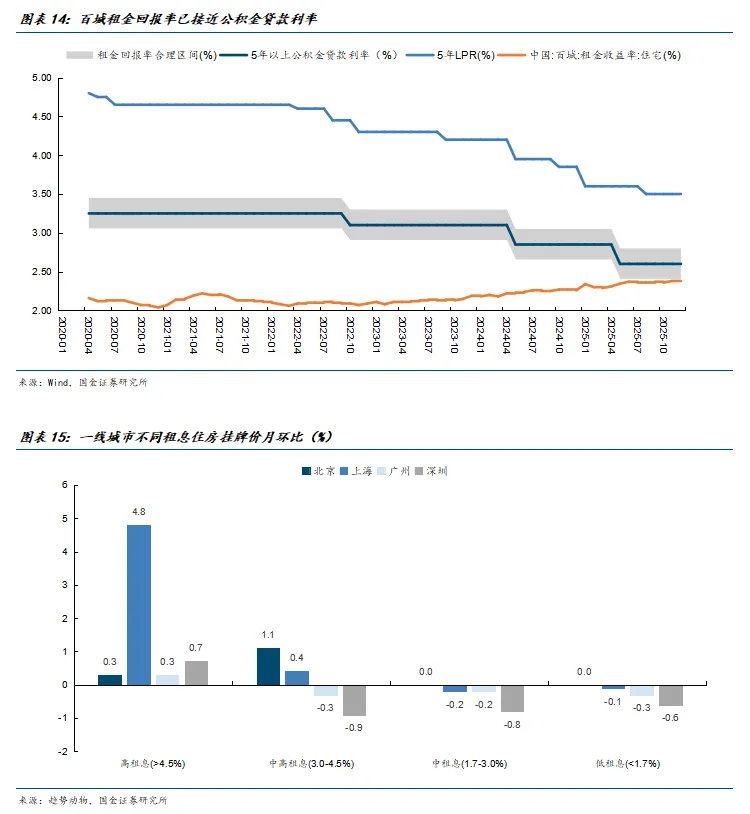 2025年12月百城租金回报率已回升至2.39%,接近2.6%的公积金贷款利率,由于我国住房持有成本较低,净租金回报率和公积金贷款利率之差已基本处于合理区间。