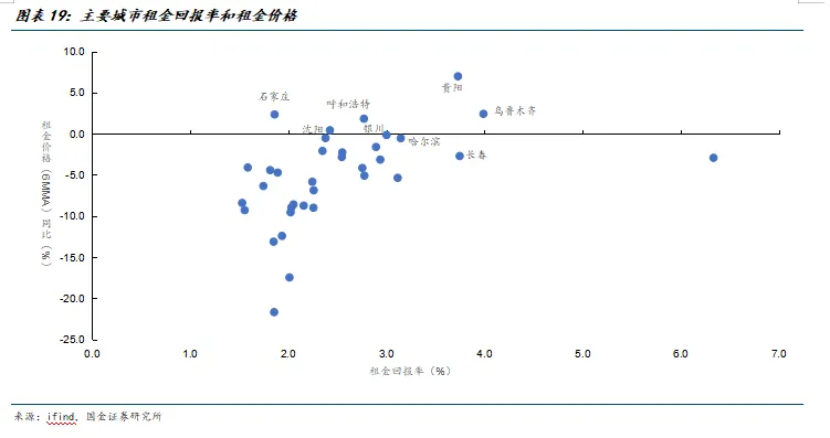 分城市看,一线城市租金价格跌幅加大,但乌鲁木齐、贵阳、哈尔滨、沈阳等二线城市租金价格已基本止跌,其租金回报率也高于2.6%的公积金贷款利率,企稳节奏有望领先于其他城市。