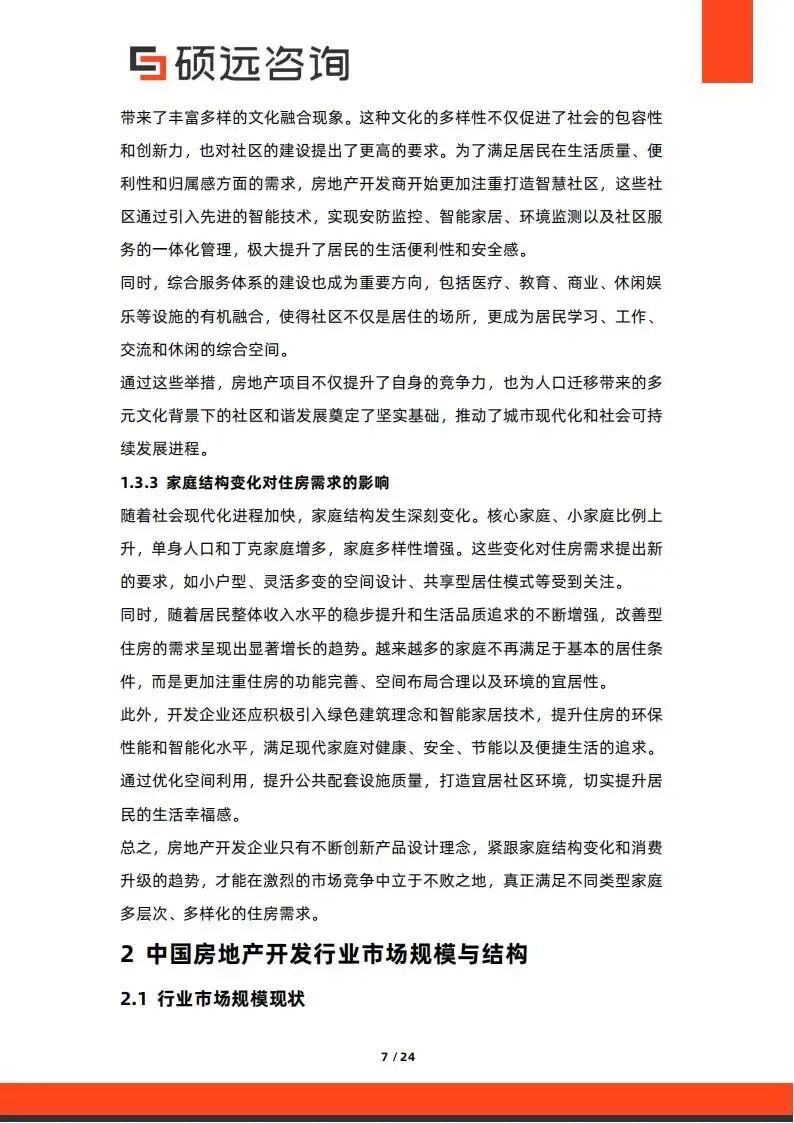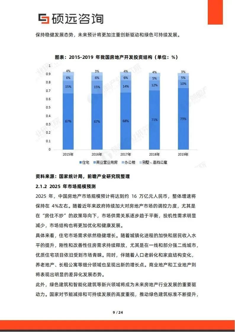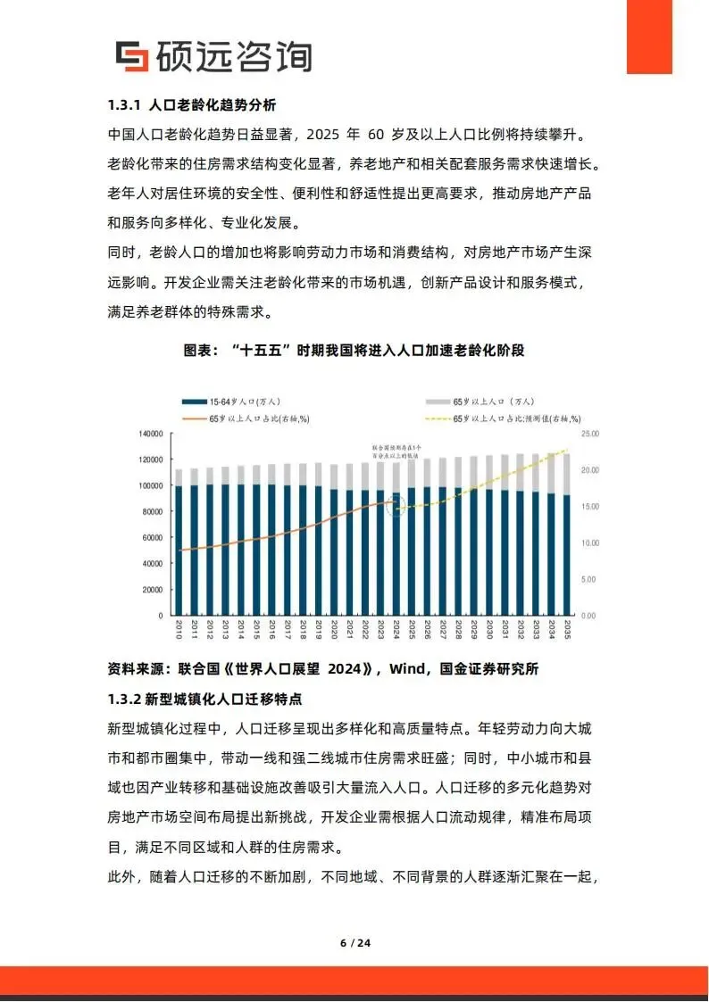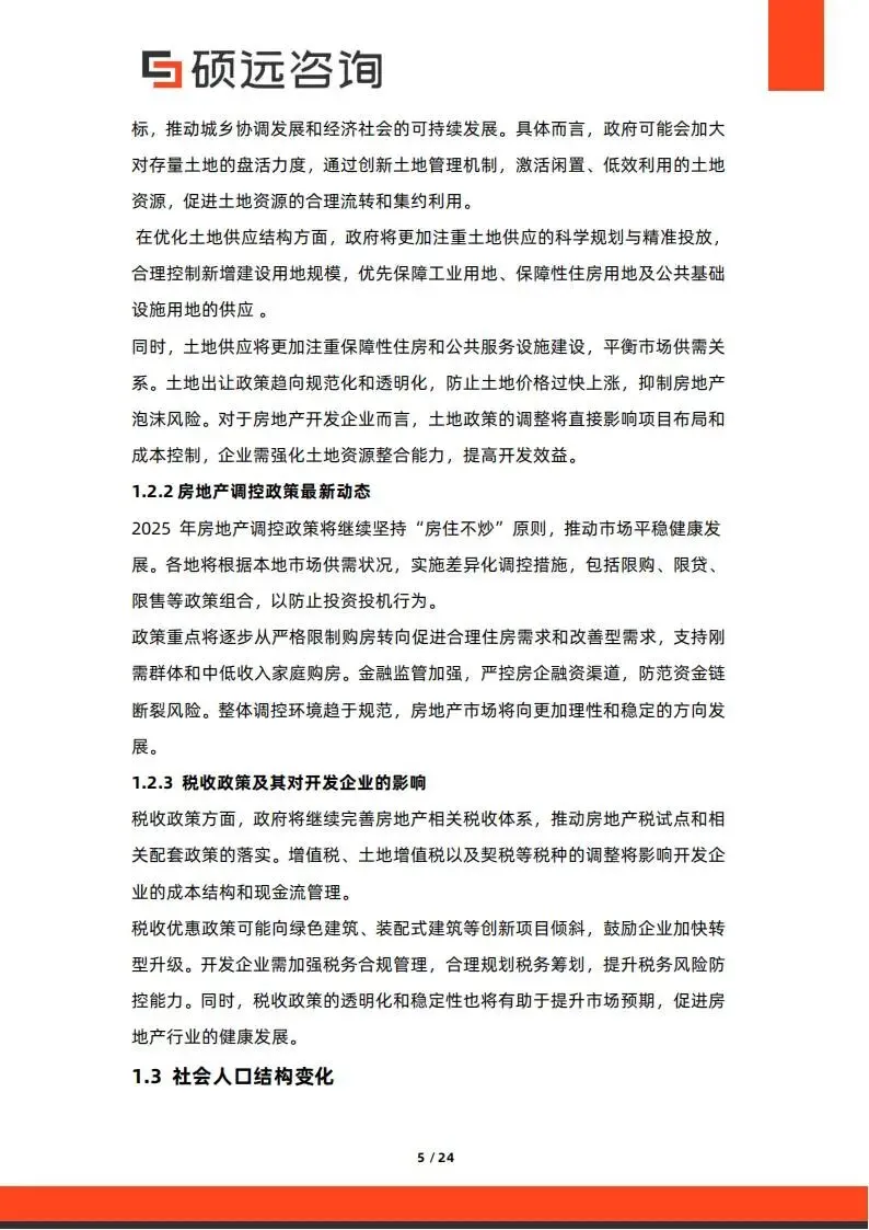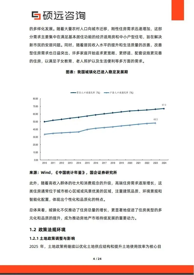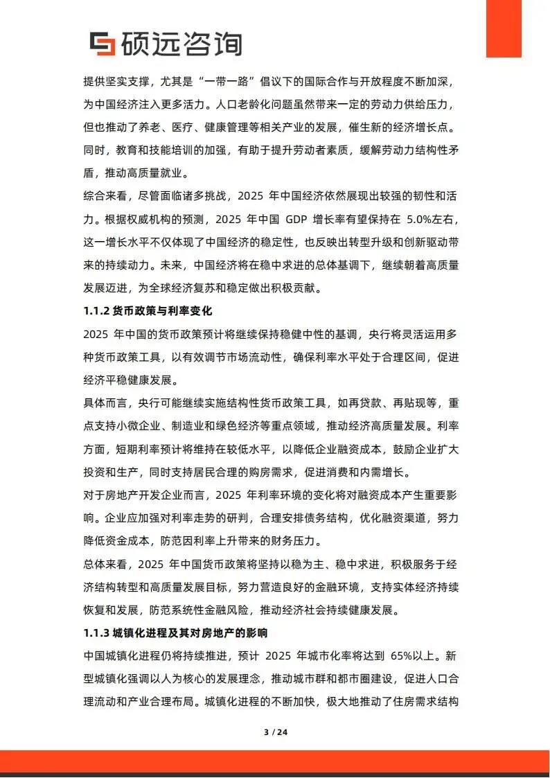 宏观环境方面,2025年中国GDP预计增长5.0%左右,货币政策保持稳健中性,利率维持合理区间以支持实体经济与合理购房需求。城镇化率将达65%以上,推动刚性、改善型及高端住房需求多元化发展。政策层面坚守“房住不炒”,土地政策优化供应结构、盘活存量,调控转向支持合理需求,税收政策向绿色建筑等领域倾斜。社会层面,人口老龄化催生养老地产需求,人口迁移呈现向大城市与县域双向流动特征,小家庭、核心家庭增多推动小户型与灵活空间产品需求。