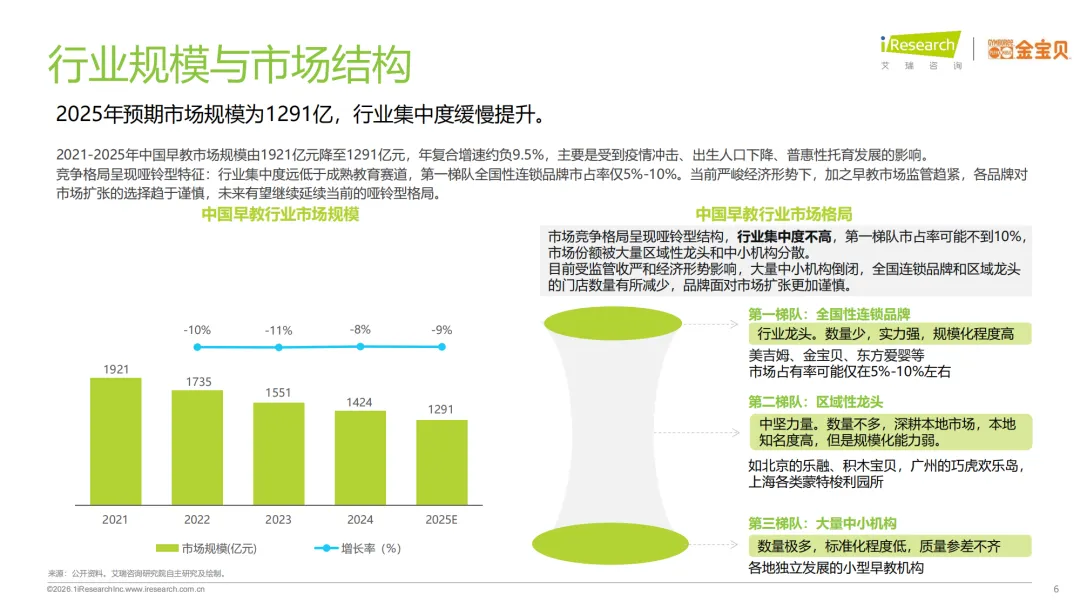 从行业规模来看,2025 年中国早教市场规模预计达 1291 亿元,2021-2025 年年复合增速约 - 9.5%,受出生人口下降、普惠托育发展等因素影响;市场格局呈 “哑铃型”,头部全国性连锁品牌(金宝贝、美吉姆等)市占率仅 5%-10%,大量区域龙头与中小机构分散剩余份额。