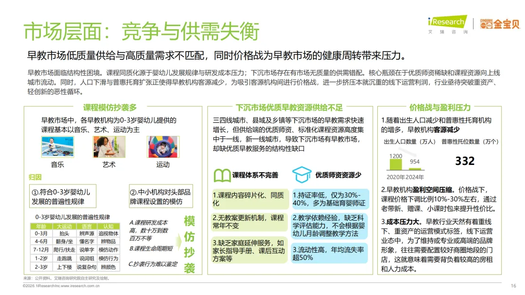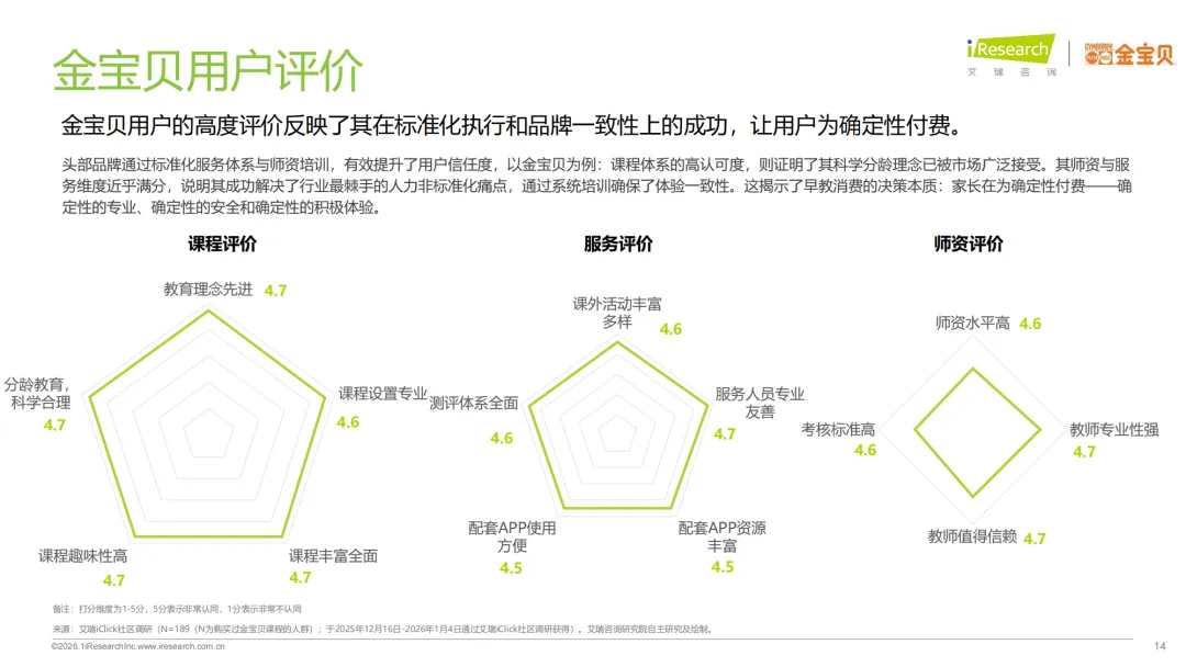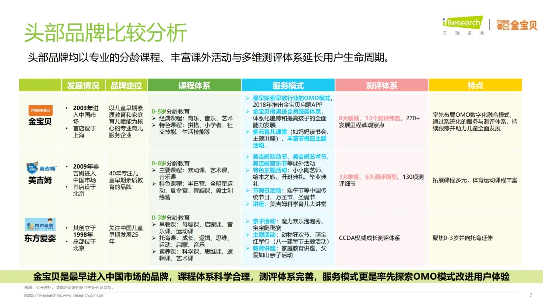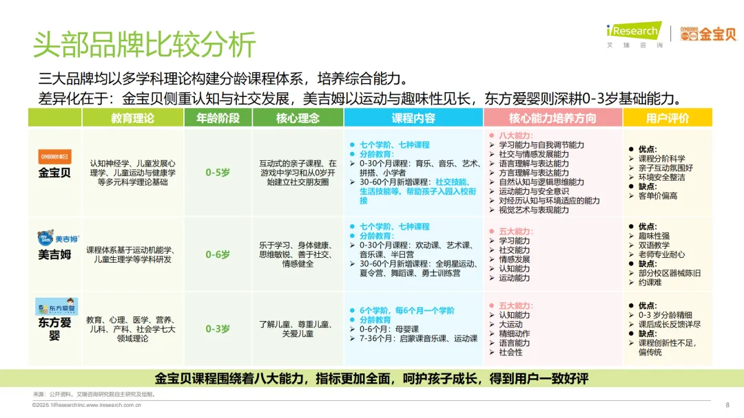 头部品牌优势:金宝贝、美吉姆、东方爱婴等以分龄课程、完善测评体系、OMO 服务为核心竞争力;金宝贝率先布局全场景会员体系,整合课程、游乐、线上内容,用户满意度评分超 4.6 分(5 分制)。