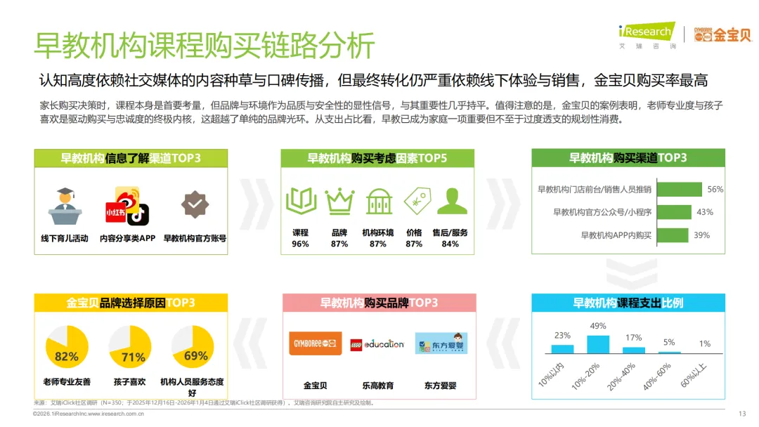 从消费行为来看,课程专业性(96%)、品牌口碑(87%)、机构环境(87%)为核心决策因素,小红书等社交媒体是主要种草渠道,线下体验与教师专业度是转化关键。