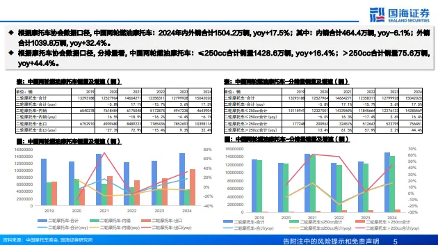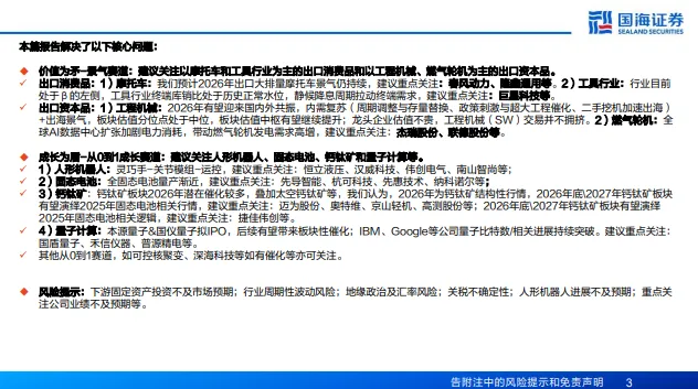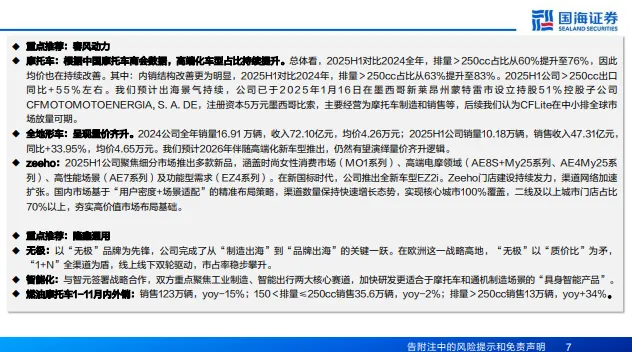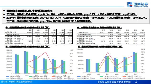建议关注以廉托车和工具行业为主的出口消费品和以工程机械、紫气轮机为主的出口资本品。出口消费品:1)摩托车:我们预计2026年出口大排量摩托车景气仍持续,建议重点关注: 风动力、用