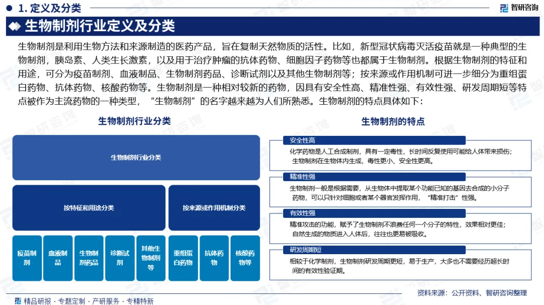 行业定义及分类:生物制剂是利用生物方法和来源制造的医药产品,旨在复制天然物质的活性。比如,新型冠状病毒灭活疫苗就是一种典型的生物制剂,胰岛素、人类生长激素,以及用于治疗肿瘤的抗体药物、细胞因子药物等也都属于生物制剂。根据生物制剂的特征和用途,可分为疫苗制剂、血液制品、生物制剂药品、诊断试剂以及其他生物制剂等;按来源或作用机制可进一步细分为重组蛋白药物、抗体药物、核酸药物等。