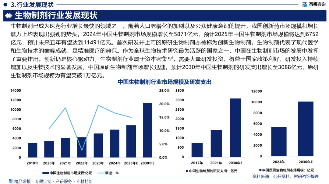 生物制剂已成为医药行业增长最快的领域之一。随着人口老龄化的加剧以及公众健康意识的提升,我国创新药市场规模和增长潜力上均表现出强劲的势头。2024年,中国生物制剂市场规模从2019年的3120亿元增长至5871亿元,预计2025年中国生物制剂市场规模将达到6752亿元,预计未来五年有望达到11491亿元。首次研发并上市的原研生物制剂亦被称为创新生物制剂。生物制剂代表了现代医学和生物技术的巅峰成就,是精准医疗的典范。作为全球生物技术研究最为活跃的国家之一,中国在生物制剂市场的发展中发挥了重要作用。创新仍是核心驱动力,生物制剂行业属于资本密集型,需要大量研发投资。得益于国家政策利好、研发投入持续增加以及生物技术的显著发展,中国原研生物制剂市场增长迅速。预计2030年中国生物制剂的研发支出增长至3088亿元,原研生物制剂市场规模为有望突破1万亿元。