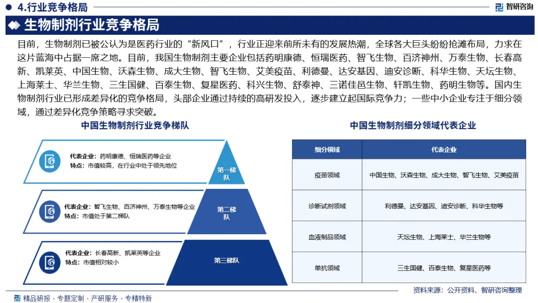 竞争情况:目前,生物制剂已被公认为是医药行业的“新风口”。生物制剂行业正迎来前所未有的发展热潮,全球各大巨头纷纷抢滩布局,力求在这片蓝海中占据一席之地。目前,中国生物制剂行业已形成差异化的竞争格局,头部企业通过持续的高研发投入,逐步建立起国际竞争力;一些中小企业专注于细分领域,通过差异化竞争策略寻求突破。