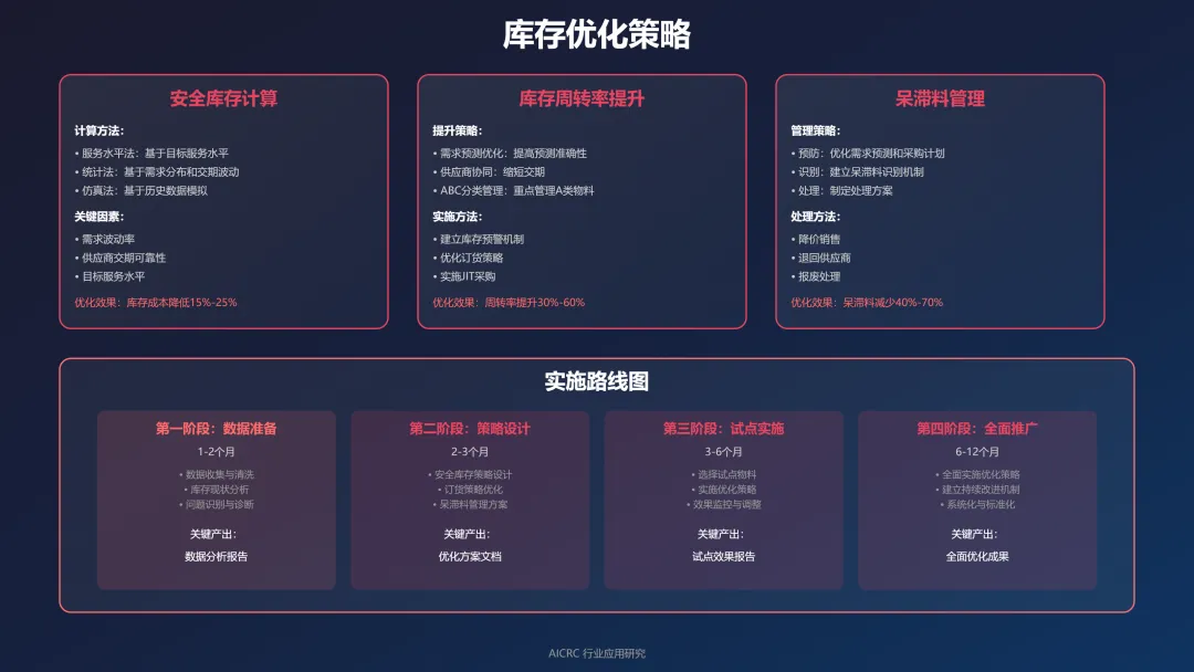 库存周转率提升策略包括需求预测优化(使用AI预测模型提高需求预测准确率)、库存分类管理(ABC分类、VMI管理、JIT管理)、库存优化算法(安全库存优化、补货策略优化、库存分配优化)。