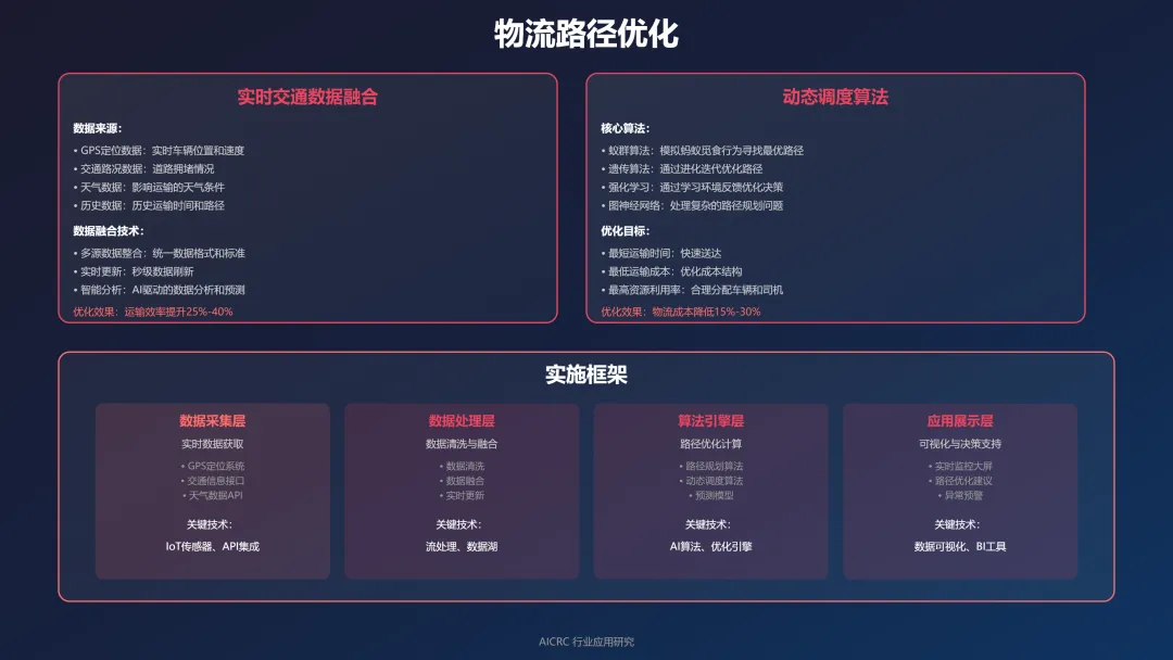 AI驱动的动态调度算法包括路径优化算法(最短路径算法、车辆路径问题、动态路径优化)、调度优化算法(遗传算法、模拟退火算法、粒子群算法)、实时调度算法(实时调度、动态调整、智能优化)。