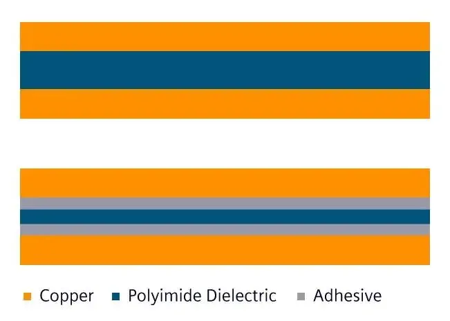 图2 柔性PCB设计可以选择使用或不使用胶粘材料。不使用胶粘材料的柔性PCB用于更高性能的产品,而使用胶粘材料的柔性PCB通常用于层数较少的常规应用。