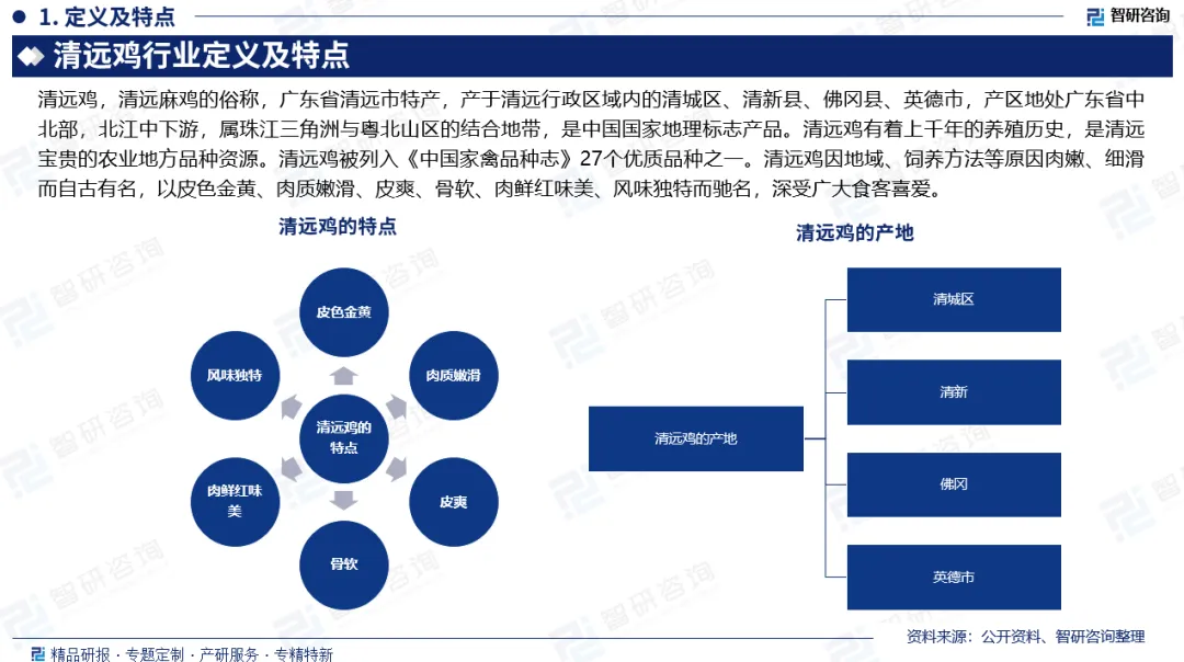 行业定义及特点:清远鸡,清远麻鸡的俗称,广东省清远市特产,中国国家地理标志产品。清远鸡有着上千年的养殖历史,是清远宝贵的农业地方品种资源。清远鸡被列入《中国家禽品种志》27个优质品种之一。清远鸡因地域、饲养方法等原因肉嫩、细滑而自古有名,以皮色金黄、肉质嫩滑、皮爽、骨软、肉鲜红味美、风味独特而驰名,深受广大食客喜爱。