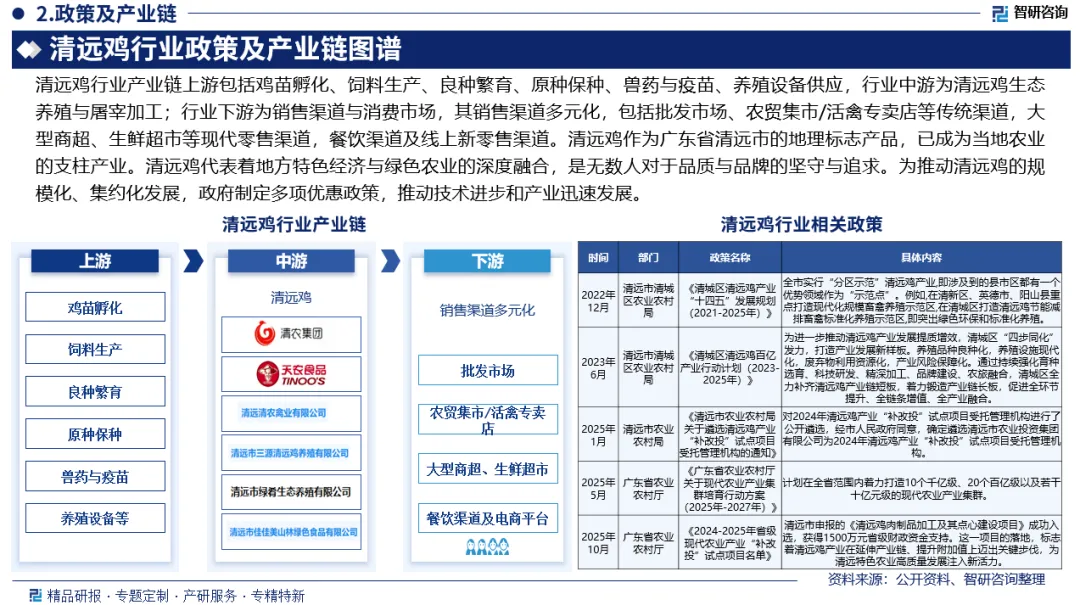 行业政策:清远鸡作为广东省清远市的地理标志产品,已成为当地农业的支柱产业。清远鸡代表着地方特色经济与绿色农业的深度融合,是无数人对于品质与品牌的坚守与追求。为推动清远鸡的规模化、集约化发展,政府制定多项优惠政策,推动技术进步和产业迅速发展。如《清城区清远鸡产业“十四五”发展规划》《清城区清远鸡百亿产业行动计划》等。