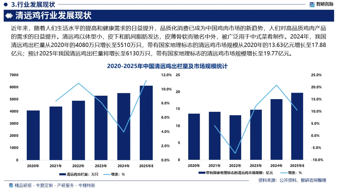 清远鸡,清远麻鸡的俗称,广东省清远市特产,中国国家地理标志产品。清远鸡有着上千年的养殖历史,是清远宝贵的农业地方品种资源。近年来,随着人们生活水平的提高和健康需求的日益提升,品质化消费已成为中国鸡肉市场的新趋势,人们对高品质鸡肉产品的需求的日益提升。清远鸡以体型小、皮下和肌间脂肪发达,皮薄骨软而驰名中外,被广泛用于中式菜肴制作。2024年,我国清远鸡出栏量从2020年的4080万只增长至5510万只,带有国家地理标志的清远鸡市场规模从2020年的13.63亿元增长至17.88亿元;预计2025年我国清远鸡出栏量将增长至6130万只,带有国家地理标志的清远鸡市场规模增长至19.77亿元。