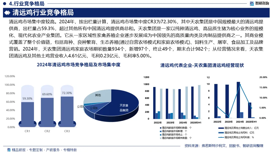 竞争情况:清远鸡市场集中度较高,主要养殖企业主要养殖企业有清远市三源清远鸡养殖、清农禽业、佳佳美山林绿色食品、广东天农食品集团、清远市绿肴生态养殖、佳佳美山林绿色食品等。2024年,按出栏量计算,清远鸡市场集中度CR3为72.30%,其中天农集团是中国规模最大的清远鸡提供商,出栏量占59.3%,超过其他所有中国清远鸡提供商总和。