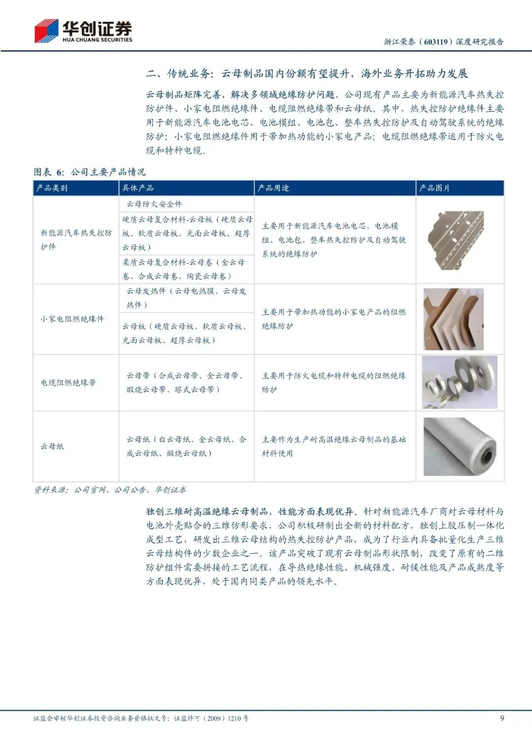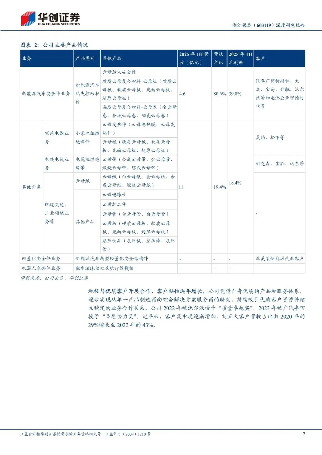 深耕云母绝缘制品二十余年,成就全球新能源安全件领先供应商。公司前身于1998年以各类耐高温绝缘云母制品起家,2013年开始研发表新能源汽车防火安全件,2016年开始陆续与特斯拉、宁德时代、华晨宝马、一汽大众、上汽大众、沃尔沃等厂商开展云母制品相关合作,逐步切入新能源车车热失控防护绝缘件领域,2025年通过收购狄兹精密进入人形机器人领域,目前拥有新能源汽车安全件、其他绝缘安全件及机器人零部件三大产品类别,公司营收从2019年的3.0亿元增长至2024年的11.3亿元,CAGR30%,归母净利从0.2亿元增长至2.3亿元,CAGR61%。