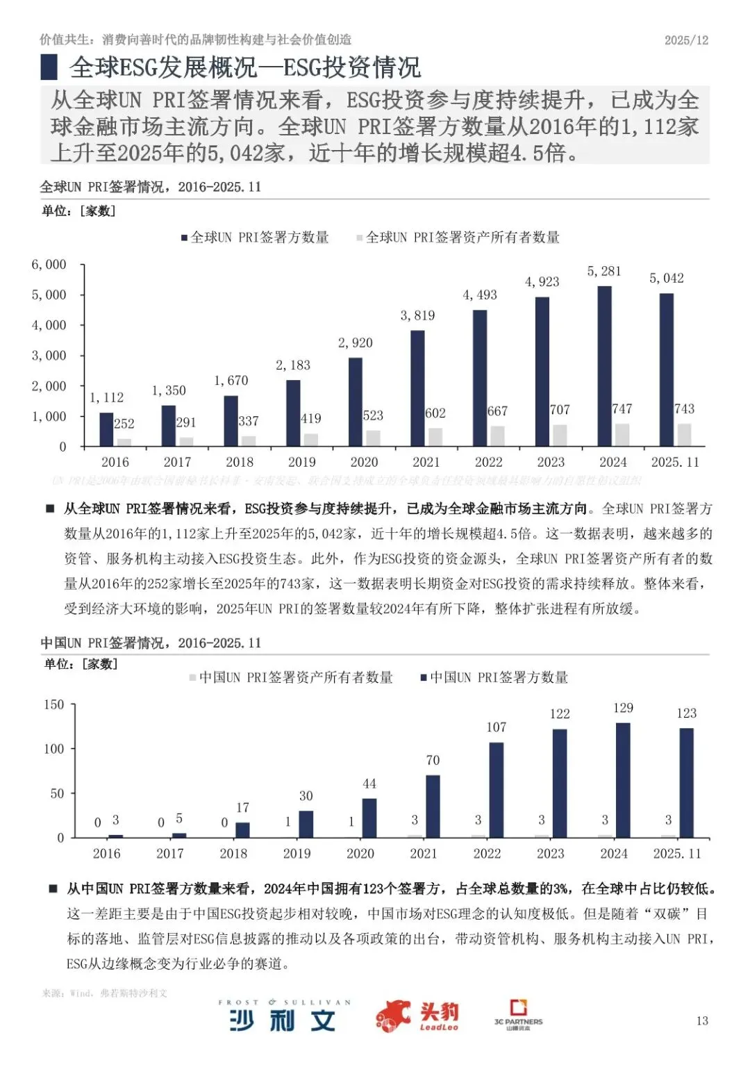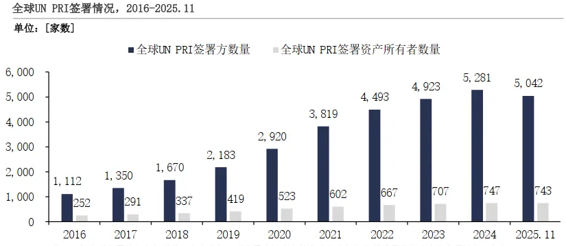 ⦁ ESG投资成为主流:全球UN PRI签署方数量从2016年的1,112家增至2025年的5,042家,ESG投资参与度显著提升。中国签署方数量占全球3%,仍处于起步阶段,但增长势头明显。