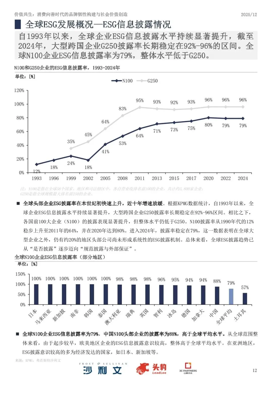 ⦁ ESG信息披露持续提升:截至2024年,全球大型企业G250的ESG披露率稳定在92%–96%,N100企业披露率为79%。中国N100企业披露率达88%,高于全球平均水平。