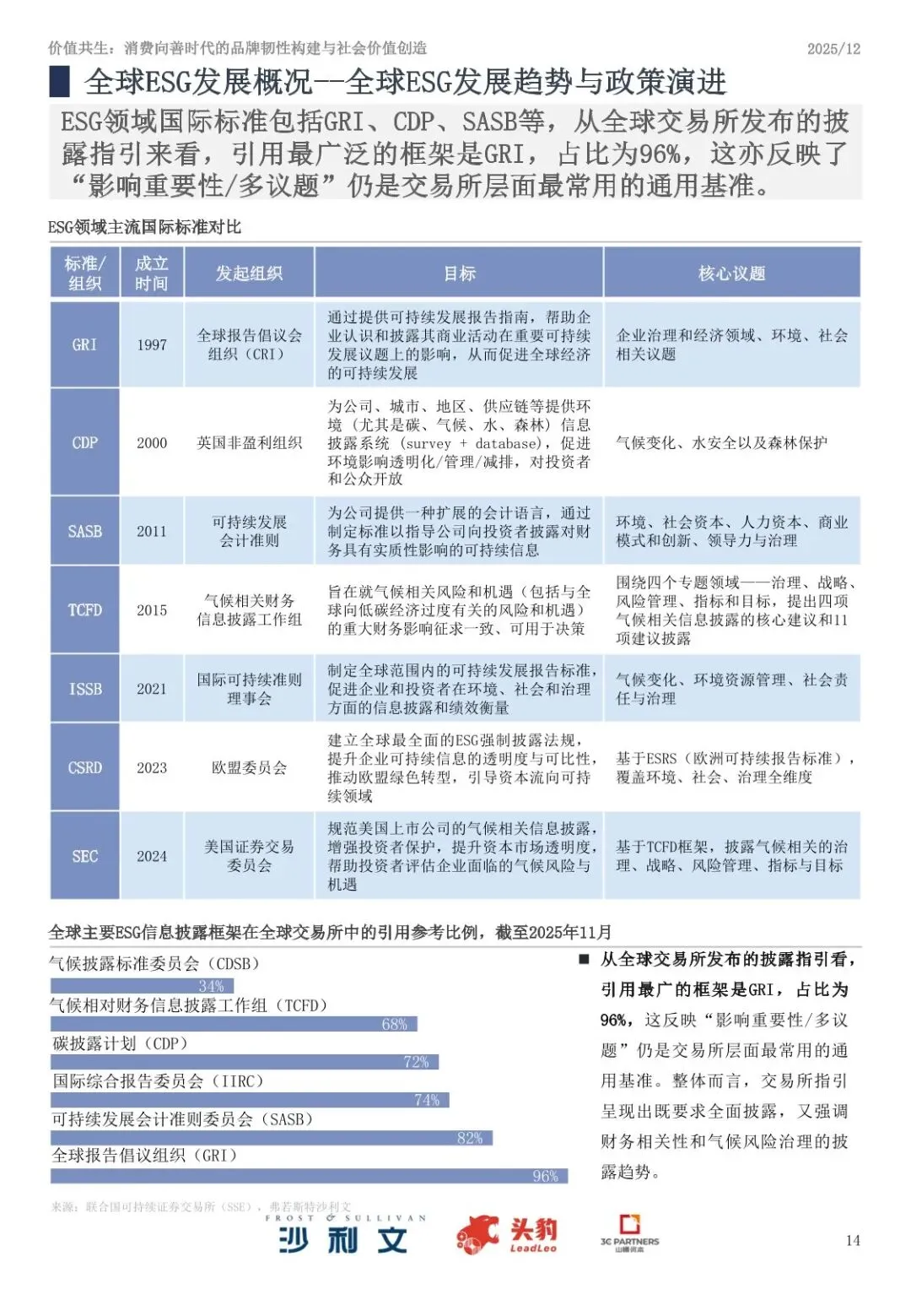 ⦁ 政策趋于严格与标准化:欧盟、美国等主要经济体通过立法将ESG纳入企业合规框架,国际组织推动全球ESG标准统一。GRI是目前全球交易所引用最广的披露框架,占比达96%。