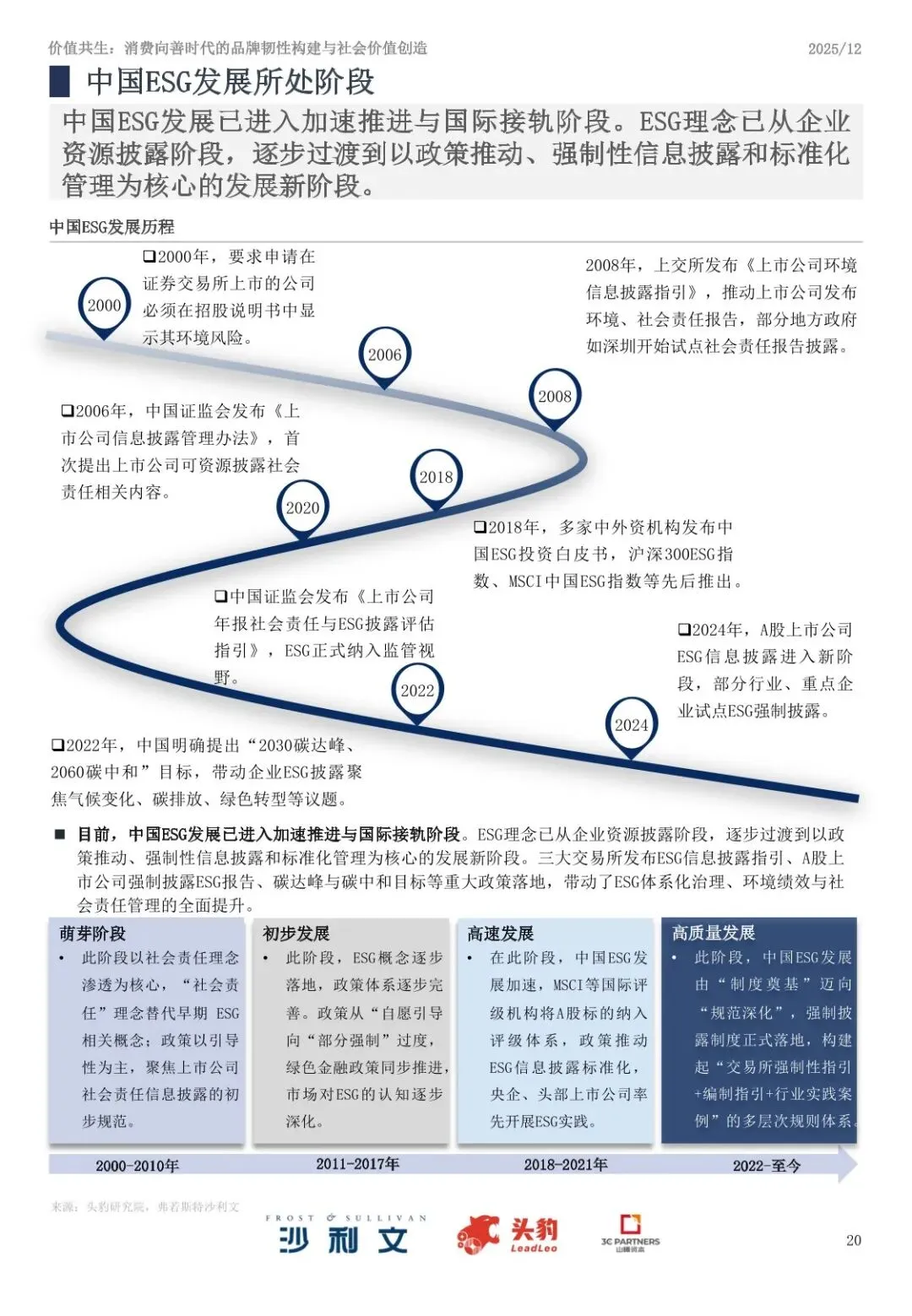 ⦁ ESG发展进入规范深化阶段:从早期社会责任理念渗透,逐步发展为政策推动、强制披露与标准化管理并行的新阶段,目前正迈向“高质量发展”。