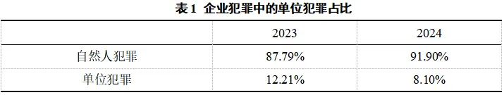 2023、2024年,符合本报告“企业犯罪”定义的案例分别有2023、2581件,其中,绝大部分被认定为自然人犯罪,较少被认定为单位犯罪,详见表1: